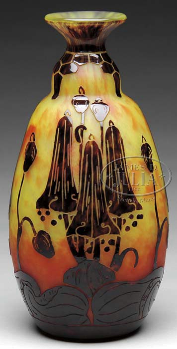 LE VERRE FRANCAIS FRENCH CAMEO VASE. Bulbous vase, in the Campanules pattern, with flared lip, has a vibrant orange and yellow mottled background that is accented with earthen-hued flowers. Etched signature “Le Verre Francais” to lower side of vase. SIZE: 12″ t. CONDITION: Very good to excellent. 5-62751 (1,500-2,500)