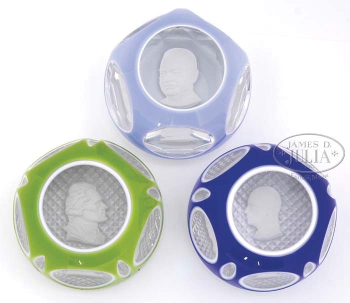 THREE BACCARAT DOUBLE OVERLAY SULPHIDE PAPERWEIGHTS. Sulphides are of Thomas Jefferson, Herbert Hoover and Dwight D. Eisenhower. SIZE: All are 3″ dia. PROVENANCE: A gift to the Maine State Museum being sold to benefit the museum’s acquisition fund. CONDITION: Very good to excellent. 5-61970 (300-500)