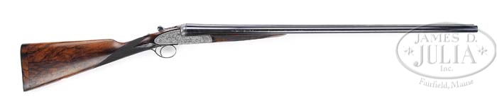 *HOLLAND AND HOLLAND ROYAL HAMMERLESS EJECTOR GAME GUN. SN 23179. (Ca. 1903) Cal. 12 Ga. 2-1/2″ Chambers. 30″ Dovetailed barrels with low concave game rib are engraved “Holland & Holland.” and “98, New Bond Street, London,” on tops. Bbl flats show Birmingham nitro proofs for 2-1/2″ chambers. Bottom of right bbl is stamped “Made in England”. Number “7085” is on splinter. Sidelock action with automatic safety (“Safe” inlaid in gold) features Holland’s patent single trigger, and rounded action bar. Action is fully engraved with classic Holland Royal open shaded scroll and acanthus, with “Holland & Holland” in stylized riband on lockplates. Bottom of action is engraved “Royal Hammerless Ejector”. Trigger plate is engraved “Patent Single Trigger”. Rounded portion of action bar fillet has relief scroll. Top lever is engraved “Patent Ejector” with no. “2” inlaid in gold. Very nicely marbled and slightly figured European walnut buttstock measures 14-9/16″ over 1″ wood extension, with ribbed horn buttplate. Extension has been professionally fitted to original length stock, including widow’s peak. Stock has gold oval on toe line with engraved monogram (JSW?). Stock features drop points, diamond grip, and 22 LPI checkering with mullered borders. Matching splinter forend has Anson release. Bore diameter: left -.728, right -.729. Bore restrictions: left -.024, right -.008. Wall thickness: left -.031, right -.033. Drop at heel: 2-1/16″, drop at comb: 1-1/2″. Weight: 6 lbs. 10 oz, LOP 14-9/16″. CONDITION: Fine. Bbls retain most all of London quality black. Side of right bbl has numerous pits which were not struck out. Action is coin finished. Stocks retain most of an old rubbed oil finish with numerous nicks and dings from handling and use. Action is tight. Bbls are on face. Ejectors are in time. Bores are excellent, bright and shiny. 4-38489 MGM149 (15,000-20,000)
