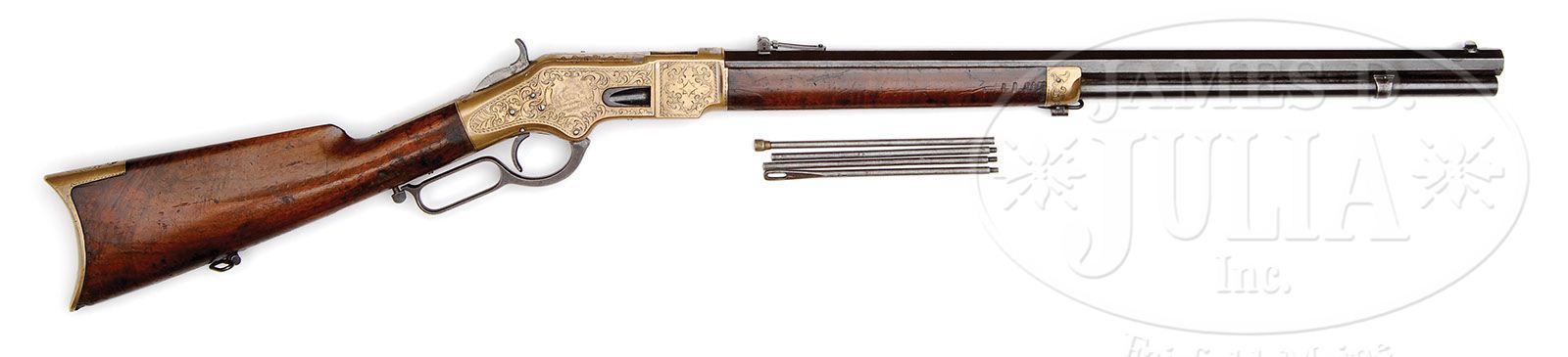 EXTRAORDINARILY RARE HERMAN LESLIE ULRICH SIGNED DELUXE ENGRAVED WINCHESTER MODEL 1866 LEVER ACTION RIFLE. SN 38542. Cal. 44 RF Henry. Spectacular and unusual ’66 rifle with 24-1/4″ oct bbl, full mag, half nickel front sight and 900 yd Henry style ladder rear sight. SN was observed on the bottom tang with last 4 digits of the matching number in the top tang channel of buttstock and inside toe of buttplate. Left side of upper tang is engraved with the initials “H.L.U.” (Herman Leslie Ulrich, 1846-1937). Left side of lower tang, under the wood, is stamped with an “S” and “XX”. Rifle is mounted with very nicely figured, center crotch, flame grain, uncheckered American walnut with straight stock and crescent brass buttplate with trap containing an orig 4-pc brass and iron cleaning rod. Bottom of stock and forend cap have factory sling swivels. Rifle is beautifully engraved with Near Eastern style motifs consisting of a panel depicting a prone hunter shooting at a crouching tiger on the left side and a Sambar stag leaping over a log in an extremely fine detailed woodland scene on right side. Both panels are surrounded by extremely well executed foliate arabesque patterns that have an extremely fine pearled or punch dot background. Front side panels are engraved in India or Moorish style motifs, also with the same fine background. Both sides are surrounded by a double chipped border. Engraving extends over the top of the receiver, top tang and bottom of the receiver with a small panel around the lower tang screw hole and around the SN. Both sides of the forend cap, along with the buttplate tang, are engraved to match. At one time this unusual rifle was silver plated. Herman Leslie Ulrich was a member of the famous family of engravers, the son of Conrad Ulrich. Herman, along with his more famous brothers, Conrad F. and John, were all engravers employed by Colt who later all worked for Marlin and Winchester as well as having their own enterprise. Some of the most famous and beautiful American engraving was accomplished by these brothers. According to Winchester Engraving, Wilson, Herman Leslie Ulrich is the only one of the three brothers who returned to engraving for Colt after having joined Winchester and in later years returned to Colt. According to the referenced publication, as of that writing, none of Herman’s works had been positively identified because “no signed examples are known”. Careful examination of the engraved initials on the upper tang of this rifle disclosed that they are authentic of the period and there is little or no doubt that these are the engraved initials of Herman Leslie Ulrich. This is believed to be the only known signed example of his work. CONDITION: Fine plus, all matching. Bbl and mag tube show light wear with only a couple of nicks on sharp edges and overall retain a smooth, dark plummy brown attic patina with clear, legible bbl address. Receiver retains 10-15% orig silver plating with the exposed brass a dark mellow mustard patina. Buttplate and forend cap are matching patina. Stock has a small band of damage near toe, otherwise wood is sound with nicks, scratches and dings and overall retains 80-90% strong orig piano varnish finish. Mechanics are fine, strong bore with scattered moderate to heavy pitting. 4-47345 JR129 (50,000-90,000)