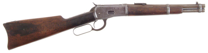 *EXTREMELY RARE WINCHESTER MODEL 1892 TRAPPER CARBINE. Cal. 44 WCF (44-40). SN 693360. Standard grade carbine with ultra rare 12″ rnd bbl, square base front sight with German silver blade and an original replacement carbine ladder rear sight. Bbl address is properly placed between rear sight & bbl band. It has a staple & ring in left side of receiver. Mounted with uncheckered, straight grain American walnut with straight stock & carbine buttplate and a rare 8″ forearm. Accompanied by an ATFE letter date stamped July 11, 2005 exempting this carbine from the provisions of the National Firearms Act of 1936 and classifies it as a “Curio or Relic”, and therefore can be sold under the normal provisions of ATFE regulations. Very few of these trappers were ever made with 12″ bbls and of those, only a handful survive. CONDITION: Fair to good. Bbl & magazine tube retain traces of finish in the most sheltered area being mostly a light brown patina. Receiver is a gray patina with fine pitting overall. Lever & hammer are a dark brown patina. Stock has a repair through wrist with some fill by left side of top tang and wood overall shows heavy, hard use with a wiped-on finish. Mechanics are fine. Dark worn bore with good rifling and a ring about midpoint. 4-56615 JR199 (6,000-10,000)