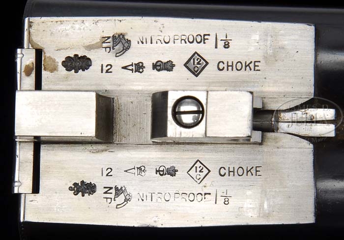 *HOLLAND AND HOLLAND NUMBER 2 SIDELOCK EJECTOR (BADMINTON) GAME GUN. SN 26952. Cal. 12 Ga. (Ca. 1913) 2-1/2″ Chambers. Gun no. 1 of a pair. 30″ Dovetailed bbls with low concave game rib (No. “1” inlaid in gold with scroll engraving at breech) are marked “Holland & Holland.” and “98. New Bond Street. London.” on tops. Bbl flats have London nitro proofs for 2-1/2″ chambers. SN is stamped on bottom of bbls. Case hardened full sidelock action features automatic safety (“Safe” inlaid in gold), double triggers, Holland patent detachable sidelocks, and gold band tumbler end cocking indicators. Water table has proofs, SN, and is engraved “Holland’s Patent”. Bottom of action is engraved “Holland’s Ejector”. Action and sideplates are engraved with about 60% coverage of very finely executed typical English scroll. Trigger guard has scroll on bow. Typical Holland style short tang has SN. Nicely mottled fiddleback figured European walnut straight grip buttstock measures 14-13/16″ over thin leather covered pad, and features vacant silver oval, drop points, diamond grip and 20 LPI checkering with mullered borders. Matching splinter forend has Deeley release (unusual for Holland), and steel tip. “1” is inlaid in gold on latch and on top lever. Bore diameter: left -.731, right -.732. Bore restrictions: left -.014, right -.004 . Wall thickness: left -.025, right -.026. Drop at heel: 2-1/8″, drop at comb: 1-1/2″. Weight: 6 lbs. 14.4 oz, LOP 14-13/16″. CONDITION: Excellent, as refurbished. Bbls retain 98% of London quality re-black, with a fair number of scrapes and knocks from handling. Action and lockplates retain nearly all of a well done case color. All engraving remains sharp. Wood retains most of an older hand rubbed oil finish with numerous marks and compressions from handling and use. Checkering has been re-cut. Bbls are bright and shiny. Action is tight. Bbls are on face. Ejectors are in time. 4-38491 MGM147 (12,500-17,500)