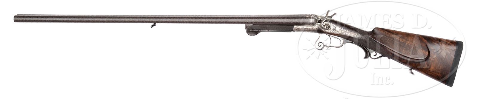 INTERESTING SLIDE AND TIP HAMMER GAME GUN BY F. R. HOLLSTEIN. SN NSN. Cal. 16 ga. 2-3/8″ Chambers. 31″ Deeply etched fine Damascus bbls are inlaid in platinum “F. R. Hollstein” on concave game rib. There are platinum bands around breech ends, surmounted by small triangles of inlaid scroll. Collath type slide and tip action with horn covered forward pivoting lever, is fitted with peninsula back action rebounding locks with rounded serpentine hammers. Action and locks are engraved with large, shaded, open, scrolled acanthus in semi relief, framing vignettes of birds and game; partridge on left, and pheasants on right side of action, with fox on left lock and pointing setter on right. Fancy scrolled trigger guard is engraved with roe deer on bow and extends into carved and scrolled horn grip. Nicely stump figured European walnut buttstock measures 13-5/8″ over black Decelerator pad, and features swept right hand cheekpiece, point pattern checkering with mullered borders, and a sling loop on toe line. Bore diameter: left-.662, right -.662. Bore restrictions: left -.002 (Cyl), right -.000 (Cyl). Wall thickness: left -.034, right -.038. Drop at heel: 2-7/8″, drop at comb: 1-5/16″. Weight: 6 lbs. 10 oz. LOP: 13-5/8″. CONDITION: Very fine, as refinished. Bbls retain essentially all of a fine chocolate brown. Action is coin finished with some darkening on lockplates. Stocks are oil finished over some relatively deep marks. New pad. Checkering has not been re-cut, but has some diamonds missing. Horn shows some slight moth damage, especially on operating lever. Bores are very fine with a few scattered pits. Action is tight. Locks are crisp. 4-49260 MGM68 (3,000-5,000)