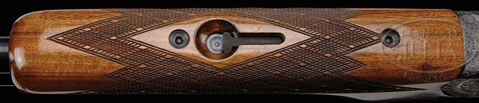 *KRIEGHOFF MODEL 32 CROWN GRADE FOUR BARREL SKEET SET WITH CASE. SN 11814. Cal. 12, 20, 28, .410 Gauges. 12 ga 2-3/4″ chambers, all others 3″ chambers. All bbl sets are 28″ with raised, ventilated ribs having ivory front and silver mid beads. All are marked “Made By H. Krieghoff Ulm – Germany” and with gauges, chambers, as well as “Bohler – Laufstahl” on left sides. Bottoms of mono-blocs are stamped with German proofs, SN, and makers name. Low profile blued O/U action with typical sliding top bolt, features single selective gold-plated trigger and automatic ejectors. Action is engraved with well cut large foliate scroll at nearly full coverage having gold wire inlay around edges. This fine scroll frames large vignettes of relief gold inlaid game birds and predators in wooded backgrounds; an eagle is stooping on and bringing down one of a trio of flushing pheasants on left side; a fox is worrying a trio of escaping mallards on right side; bottom of action has large relief inlaid crown with “Krieghoff Model 32″ flush inlaid in gold. Nicely fiddle figured European walnut full skip-line checkered pistol grip Monte Carlo buttstock measures 14-3/8” over brown “Decelerator” sporting clays pad. Matching one piece ejector forend fits all bbl sets. 12 ga ported bbl set: Bore diameter: top -.732, bottom -.729. Bore restrictions: Screw chokes (7 tubes included). Wall thickness: top -.046, bottom -.043. Drop at heel: 2-5/8″, drop at comb: 1-11/16″. Weight: 8 lbs. 0 oz, LOP 14-3/8″. 20 ga. Bbls: Bore diameter: top -.616, bottom -.614. Bore restrictions: top -.003, bottom -.002. Wall thickness: top -.050, bottom -.052. Drop at heel: 2-5/8″, drop at comb: 1-11/16″. Weight: 8 lbs. 3 oz, LOP . 28 ga Bbls: Bore diameter: top -.549, bottom -.549. Bore restrictions: top -.008, bottom -.005. Drop at heel: 2-5/8″, drop at comb: 1-11/16″. Weight: 8 lbs. 2 oz, LOP 14-3/8″. 410 Bbls: Bore diameter at muzzles: top -.399, bottom -.402. Weight: 8 lbs. 0 oz, LOP 14-3/8″. Original brown leather case with brass plated locks has brown interior, with top compartment for gun and forend, which also contains choke tubes. Bottom compartment contains all four sets of bbls. PROVENANCE: Wes Adams Estate Collection. CONDITION: Very fine. Bbl sets retain nearly all of their orig blue. Blue of action is considerably silvered at bottom. Sides of action are turning brown from age. Wood retains most of its orig finish with numerous minor marks and light scratches from normal handling and use. Bores are excellent. Action is tight. Mechanically fine. 4-44877 MGM226 (10,000-15,000)
