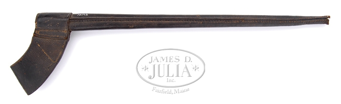 CONFEDERATE TREDEGAR SOCKET BAYONET SCABBARD AND FROG. This is another example of the very rare Confederate angular bayonet scabbard. It is all hand-stitched and in very good condition overall, with exception of its broken tip, which at one time had a lead finial. This scabbard retains much of its orig black surface with only minor crazing and loss of finish. Frog is very good, though dry. Mr. Michel’s Notes State: “Perhaps the rarest Confederate leather accoutrement is the scabbard for the socket bayonet. Having no civilian use, thse few that survive only do so because some veteran saw it as an appropriate souvenir if otherwise lacking the appeal of a cartridge or cap box, much less a Bowie knife or canteen. This example is of heavy leather and shows no sign of ever having a trip unless it was a simple lead finial sewn into the leather. Most likely the body of the scabbard was simply sewn down to the end.” PROVENANCE: Ben Michel collection. CONDITION: Overall, surfaces are dry. Black surface is flaking but mostly intact. Tip of scabbard is broken off. 4-31428 JS41 (1,000-2,000)