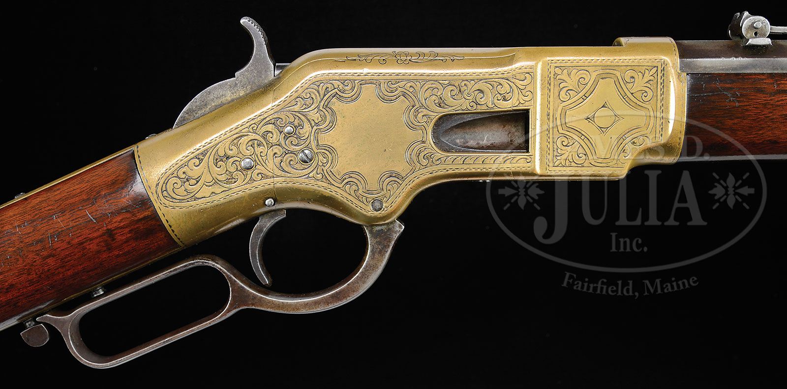 EXTREMELY RARE HERMAN L. ULRICH ENGRAVED WINCHESTER MODEL 1866 LEVER ACTION RIFLE. SN 38549. Cal. 44 RF Henry. Wonderfully rare ’66 rifle with 24-1/4″ oct bbl, full magazine with special German silver Rocky Mountain front sight and 900 yard Henry ladder rear sight missing its slide. Mounted with uncheckered, straight grain American walnut with straight stock & crescent buttplate with trap containing an orig 4-pc brass & iron cleaning rod and has the matching SN inside the toe. Receiver and presumably the other brass parts were all originally silver-finished. Left side of lower tang is marked “S” and “XX”. Left side of upper tang, under the wood, is hand engraved “H.L.U” (Herman Leslie Ulrich, 1846-1937). Receiver is beautifully engraved in broad, sweeping, intertwined foliate arabesque patterns with very fine pearled or punch dot background. Center of each sideplate has a large open panel with scrolled edges on left side and a chimera head incorporated into the scrolls on left side. Front side flats have matching fleur-de-lis and geometric patterns with all the engraving surrounded by a fine dbl chip border. Additional patterns extend over the top & bottom of the receiver, top tang, forend cap & buttplate tang. Lever is of the early style with small finger loop. Stock & forend cap have factory sling swivels. This rifle is pictured, both sides, on Pg. 65 of the 1985 edition of The Winchester Book, Madis with credit to Purple Sage Guns. Until very recently there were no known signed examples of Herman Leslie Ulrich engraving. Mr. Ulrich was one of the very famous Ulrich brothers, the son of Conrad & Anna Ulrich, who were all variously employed by Colt, Winchester & Marlin as engravers. According to The Book of Winchester Engraving and Winchester Engraving, both by Wilson, “Herman’s firearms work has yet to be identified positively, because no signed examples are known”. Mr. Wilson also states that Herman is the only one of the three brothers to return to Colt after joining Winchester and later again left Colt for Winchester. Herman’s work, as seen here, has similarities to both John & Conrad’s work but is slightly more bold with a finer background. Accompanied by a 3-page letter from renowned Winchester historian & author, George Madis, who details some of the above information and notes that the buttstock & forearm are replacements. Mr. Madis notes that this is only the third Herman Ulrich signed gun that he had seen.The Winchester Book, Madis PROVENANCE: Barnes Family Collection. CONDITION: Good to very good. Bbl & magazine tube retain thin orig blue in the most sheltered areas being mostly a mottled plummy brown patina with a few nicks, dings & scratches and some scattered fine pinprick pitting; receiver, forend cap & buttplate show moderate wear with a few nicks & scratches and retain traces of orig silver in the most sheltered areas. Lever & hammer are a light plummy brown patina. The replacement buttstock & forearm are sound with light nicks & scratches and retain most of their custom finish. Mechanics are fine, strong bore with good rifling with fine pitting and a few spots of deeper pitting. Cleaning rod is fine. 4-47655 JR211 (30,000-50,000)
