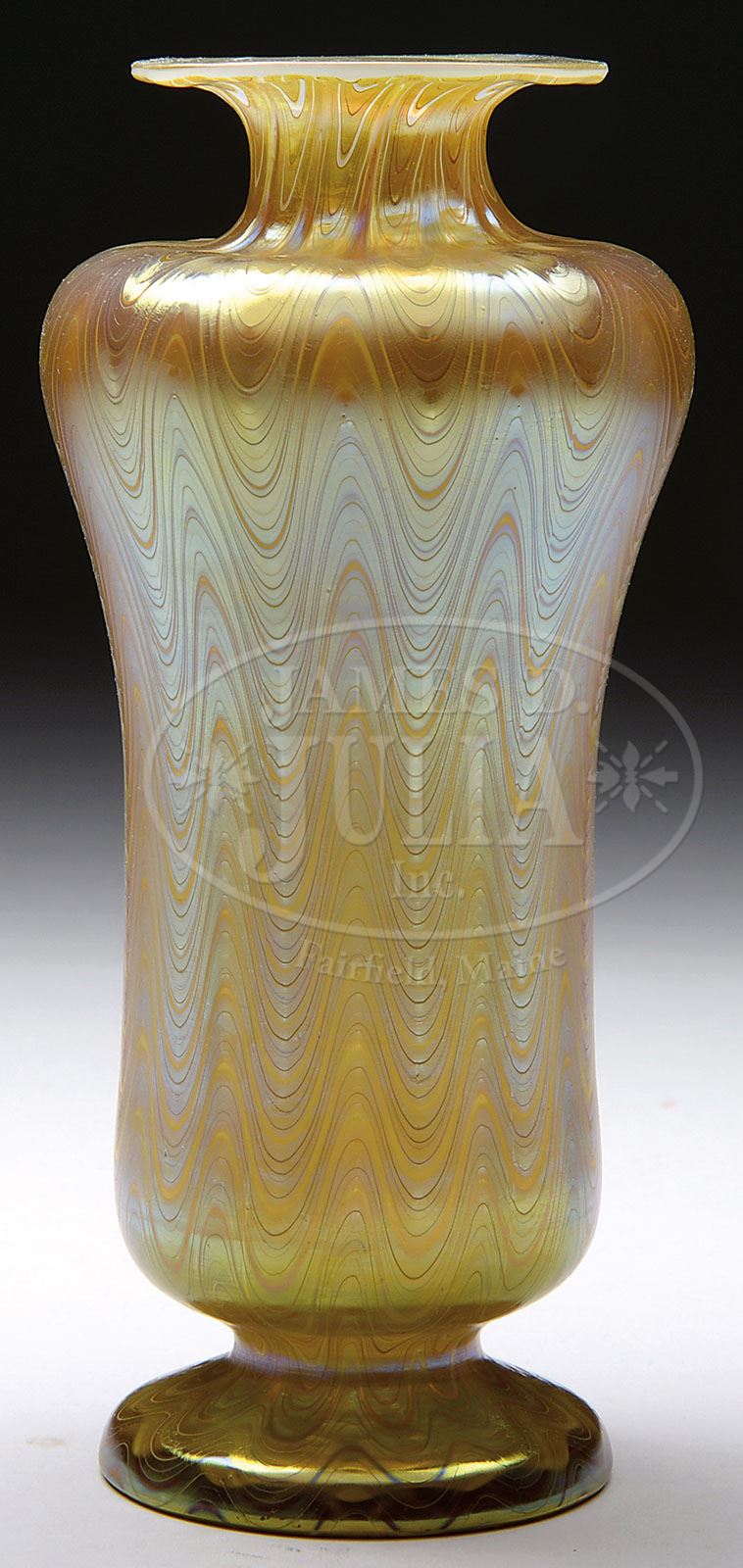 LOETZ PHANOMEN VASE. Very pretty Loetz vase has bright gold iridescent finish in a wavy Phanomen pattern. Iridescence shows nice blue highlights. Unsigned. SIZE: 8-1/4″ t. PROVENANCE: From a private Connecticut collection. CONDITION: Very good to excellent. 5-66951 (800-1,200)