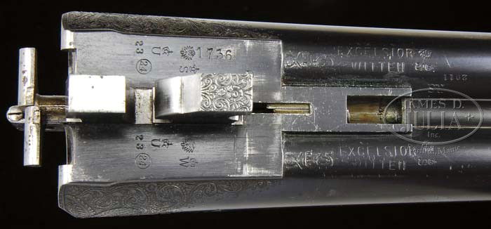*RARE AND DAINTY CHAS DALY REGENT DIAMOND 24 GA SHOTGUN. SN 1736. Cal. 24 Ga. Wonderful, Prussian, Linder made Daly with factory 24” bbls, 2-3/4″ chambers with tapered, concave, matted ribs and sgl metal bead.“CHARLES DALY REGENT DIAMOND QUALITY” is inlaid in gold with scroll engraving extending about 6-1/2” up the rib. It has a rib extension with dbl bites, selective ejectors & checkered dbl triggers. Dovetail bbls are made of Excelsior steel by Witten and bear the maker’s brand along with the crossed pistols and “HAL” markings indicative of Linder made guns. Scalloped receiver is stamped “PRUSSIA” on the water table is wonderfully engraved with full coverage flowing deep-relief scrollwork having a small oval vignette of four partridge on left side, two pheasant on right side, the indicative large gold crown is on bottom with two intricate snipe in an oval on trigger bow. Fences are deep relief engraved in flowing acanthus patterns with sculpted rib across radius with side clips. Receiver also has cocking indicators & maker’s name along the base of the bbl bosses with “SAFE” in gold on top tang. Mounted with superb,honey & chocolate Circassian walnut with ebony tipped Prince of Wales grip with checkered side panels and drop points. Bottom of stock has a small gold oval engraved “H.M.A.”. Matching splinter forend has ebony tip with appended metal engraved to match gun. Bore diameter: left -.587, right -.589. Bore restrictions: left -.020, right -.003 Wall thickness: left -.025, right -.023. Drop at heel: 2-7/8″, drop at comb: 1-3/4″. Weight: 4lbs. 12oz, LOP 13 3/4” over a 1/2″ well-matched stock extension and solid red pad. PROVENANCE: Ex- William Keith Neal Collection (Consignor’s grandfather and noted British antique arms collector). CONDITION: Very good plus. Bbls retain most of their orig finish with areas of light to moderate pitting towards the muzzles and one or two light handling marks. Action retains most of its vibrant case colors underneath sharp engraving. Wood is sound and retains about all of its orig hand rubbed finish with scattered light dents & dings from normal handling. Recoil pad is slightly flattened and separating from its base at toe. Bore is bright and shiny. Mechanics are crisp, ejectors in time. A diminutive and rare beauty! Schoverling ,Daly & Gales offered this grade(No. 500)at $500 in their 1907 catalog. 4-45629 JWD24 (15,000-20,000)
