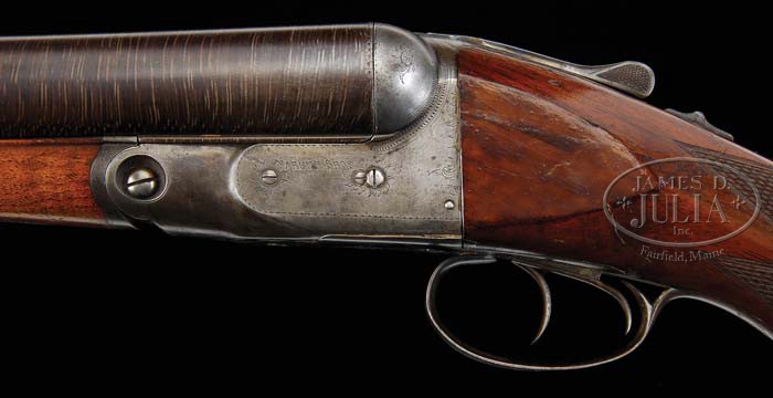 *COLOSSAL PARKER BROTHERS PH GRADE SIZE 6 FRAME WITH 40″ TWIST BARRELS. SN 94278. Cal. 8 ga. 40-1/2″ twist steel bbls, tapered concave rib with sgl sighting bead, extractors and dbl triggers. Top rib of bbl is marked “PARKER BROS MAKERS. MERIDEN CONN. TWIST”. The colossal size “6” frame has usual “P” grade engraving with “PARKER BROS” on each side, star shaped scroll around the screws, minimal scroll border, and small star burst of scroll on trigger plate. Mounted with nicely figured straight grain walnut, with some fiddle back, checkered pistol grip, Parker hard rubber gripcap, Parker’s dogs head hard rubber buttplate, checkered splinter forend. Bore measurements for 8 ga. are unavailable, drop at heel: 2-15/16″, drop at comb: 1-1/2″, weight 16lbs 9oz. LOP 14-3/16″. The book Parker Gun Identification & Serialization indicates as PT grade, hammerless, no extras, capped pistol grip, 8 ga., with 40″ bbls. According to the chart of known 8 ga Parkers taken from the Parker Story, there was a total of only 11 40″ 8 ga. produced, 8 of them being hammerless. CONDITION: Very good to fine. Bbls retain a dark brown twist pattern, with normal nicks, dings & scratches, and brighter under protected forearm area. The giant frame retains mostly a silver and brown patina with hints of faint case colors in protected areas. Stock is sound with a repaired crack on left side between the tangs, a couple hair line cracks behind top tang, good checkering, some typical nicks, scratches and shallow dents, retaining orig finish with hand worn finish in grip and comb area. Forend is sound with good checkering, minor nicks & dings, and retains orig finish with some hand worn patina. Mechanics are good with auto-safety, bores are not bad, but have some shallow scattered pits. 4-39758 BDT115 (6,000-10,000)