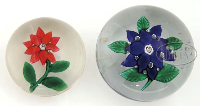 TWO ANTIQUE POINSETTIA PAPERWEIGHTS. 1) New England red poinsettia with green leaves and stem. 2) Sandwich blue poinsettia with green leaves and stem. Rough pontil. SIZE: 2-3/8″ dia x 1-3/4″ t and 3″ dia x 2-1/4″ t. PROVENANCE: A gift to the Maine State Museum being sold to benefit the museum’s acquisition fund. CONDITION: Red poinsettia is very good to excellent. Blue poinsettia has numerous surface spalls. 5-61980 (300-600)
