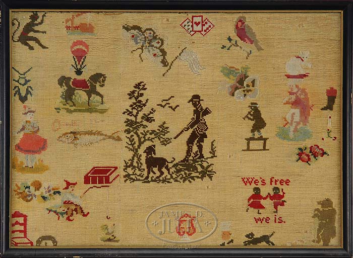 AMERICAN PICTORIAL SAMPLER TITLED “WE’S FREE WE IS”. 2nd half 19th century. This unsigned sampler wrought overall with whimsical scenes centering a hunter and his dog. Surrounding figures include a pair of dancing Afro-American children framed within the words “We’s free we is.”; a dancing bear, a cow balancing a cat, a bird on a branch, a butterfly, a flag, a hand of cards, a prancing horse, a hot-air balloon, etc. SIZE: 15″ x 21″ sight. PROVENANCE: From and East Sangerville, Maine private collection. Acquired in the 1970’s in the Brunswick, Maine area. CONDITION: Some minor damage to background lower right corner facing and upper tier in background. Colors strong, though slightly faded, otherwise very good. 9-94963 (400-500)