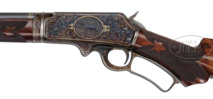 EXTREMELY RARE DELUXE ENGRAVED PRESENTATION QUALITY MARLIN MODEL 1893 TAKEDOWN LEVER ACTION RIFLE. SN 155286. Cal. 30-30. Spectacular Marlin with 26″ oct to rnd bbl, full magazine, takedown with German silver Rocky Mountain front sight and sporting rear sight. Mounted with highly figured, shell grain European walnut with #10 checkered & carved forearm and serpentine pistol grip stock with Marlin hard rubber buttplate. Carving consists of a maple leaf and special borders on each side of both stock & forearm. SN is on bottom of receiver, left side of top tang, under the wood and inside top tang channel of buttstock. Receiver is engraved in spectacular #10 style, by Conrad Ulrich. Engraving consists of the large oval vignette of a semi-relief bull moose in a very detailed forest scene with very fine stippled background. Right side is engraved in a slightly smaller vignette of an extreme highly detailed grizzly bear in a mountain scene. Both sides of receiver have nearly full coverage, semi-relief grape leaves with fine punch dot background. Both vignettes are outlined in inlaid gold wire. Bolt is engraved to match with a flower blossom in the center surrounded by gold wire inlay. Bottom & top of receiver are engraved in foliate arabesque patterns with grape leaves in the center on top side flats. Lever boss, top tang, takedown ring & forend cap are engraved to match. Sides of lever & the exposed flats of the bbl, over chamber area are engraved in light arabesque patterns. Chamber area of the bbl and around the caliber marking is inlaid with two platinum wire inlays and a gold wire inlay with three gold dots on each side. Forend cap has a sgl platinum wire inlay. While 1893 Marlin rifles are not uncommon such rifles that are engraved with extensive coverage such as this one with special carved wood and gold & platinum inlays, and with high orig finish are exceedingly rare. PROVENANCE: Wes Adams Estate Collection. CONDITION: Extremely fine plus, all matching. Overall rifle retains virtually all of its crisp orig factory finish with bright orig blue and brilliant case colors, only slightly faded on takedown ring and outer faces of finger loop. Wood is sound with a few, very light handling & storage nicks & scratches and retains virtually all of its brilliant piano varnish finish. Mechanics are crisp, brilliant shiny bore, may be unfired. 4-44653 JR326 (30,000-50,000)