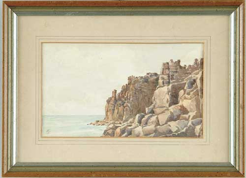 ALFRED THOMPSON BRICHER (American, 1837-1908) ROCKY COASTLINE. Watercolor on paper shows rocky coastline with blue ocean. Signed lower left with conjoined initials “ATB”. Housed in a modern simple wood frame with older white matte, no glass. SIGHT SIZE: 5” x 8-1/4”. CONDITION: Good. 9-99212 (1,000-2,000)