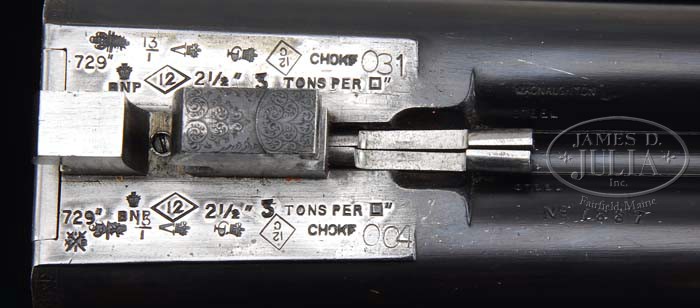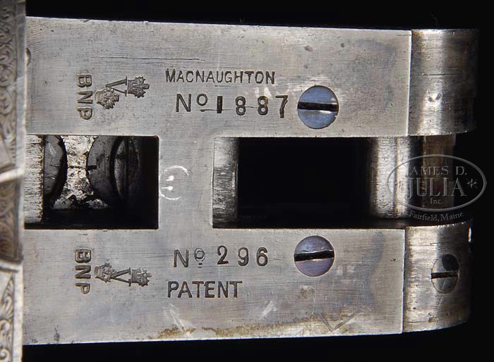 HIGHLY DESIRABLE MACNAUGHTON BEST QUALITY ROUND ACTION GAME GUN. SN 1887. Cal. 12 ga. 29-7/8″ bbls, with tapered concave rib, single silver sighting bead, 2-3/4″ chambers, CYL/MOD chokes, ejectors and dbl triggers. Top rib is engraved “JAMES MACNAUGHTON, 26 HANOVER STREET EDINBURGH. AND PERTH.” Breech end of rib has 1-1/2″ wedge of scroll engraving and breech end of bbls have a band of border engraving, a liteweight and desirable round body action is finely engraved with foliate arabesque scroll covering 95% of the action. Top of the fences have ribbons engraved on left side “MACNAUGHTON” and right side “EDINBURGH”. Top tang has pivoting lever safety. Mounted with nicely figured walnut, checkered splinter forend, with lever release, checkered straight grip stock, leather covered recoil pad and blank gold oval. Bore diameter: left -.731, right -.731. Bore restrictions: left -.029, right -.002. Wall thickness: left -.021, right -.026. Drop at heel: 2-1/4″, drop at comb: 1-9/16″. Weight: 6lbs. 13oz. LOP 14-1/2″. Bbl flats are covered with proof marks “729 2-1/2″ & 3 tons per sq. inch”. CONDITION: Very fine. Bbls retain 85-95% blue with minor nicks & scratches and minor thinning through forearm area blending with gray patina. Action retains 50-60% orig case hardening, strong in protected areas and blending with light brown patina across bottom. Stock is sound with freshened checkering, some minor nicks and handling marks and retains a fine hand rubbed oil finish. Forend is sound with freshened checkering a few minor nicks & dings and retains a fine hand rubbed oil finish. Mechanics are crisp with non-auto safety, strong ejectors, shiny bores with a couple minor very shallow pits in right bbl. 4-37990 BDT218 (7,500-10,000)