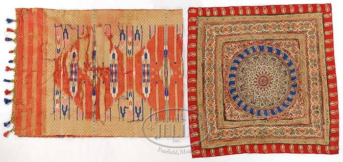 2 MIDDLE EASTERN TEXTILES. 19th century. The FIRST, a square example with a central rondel of arabesque design, bordered with botehs on an indigo ground within multiple square panels, each uniquely woven with floral vinery and scrolling cartouches, the outer madder red border with a line of botehs, each panel woven separately then attached to the whole. The SECOND example, a panel in three sections, designed as a wall hanging, wrought in salmon and shades of indigo and beige, having an overall geometric design; decorated with stylized arrows, many woven with metallic thread. SIZE: FIRST: 4’11” x 4’10”. SECOND: 11′ x 4’1″. CONDITION: Both in as-found condition. 9-95548 (200-400)