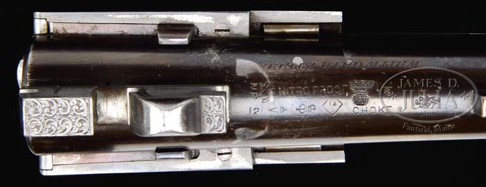 *CHARLES LANCASTER SIDE LOCK EJECTOR OVER UNDER GAME GUN WITH TWO SETS OF BARRELS, AND ORIGINAL CASE. SN 13922. Cal. 12ga. 2-3/4″ Chambers. Double triggers. Automatic safety. Bbl set no. 1: measures 28″ and is marked on right side rib “Charles Lancaster, 11 Panton St. Haymarket. London.” Left side rib: “Hammerless Ejector Patent”. Left ejector bolster is engraved “2 1/2 inch cases”. Top barrel has London nitro proofs for 1-1/8 shot, w/ 1″ triangle of scroll engraving in front of the bbl extension, and has no rib. Front sight is set on a small ramped block. Bottom bbl has identical proofs as top, is engraved “Whitworth Steel” and is stamped with the Whitworth sheaf of wheat logo, as well as SN “13922” and “CL”. Barrel set no.2 measure 32″ and has all the same specifications as no. 1, except SN is stamped “13922.2”. The case hardened and open shaded scroll engraved action has very nicely filed fences and is marked “C. Lancaster, London.” in a double riband on each side of the action. Back action leg o’ mutton side locks are scroll engraved at about 60% coverage w/ open shaded work scroll, and engraved “Charles Lancaster.” Trigger guard has matching scroll and SN “13922” engraved at the grip. “Safe” is inlaid in gold on the stepped top tang. Lightly figured and streaked straight grip English walnut buttstock measures 14-1/2″ over serrated wood butt and features 20 LPI flat top checkering w/ mullered borders, and a silver oval engraved w/ initials “D.R.H.” (Daniel R. Hanna) Unusually shaped one piece splinter forend has a Deeley and Edge release, horn tip, and checkering to match buttstock. Barrel and stock dimensions: Set no. 1 (28″): Bore diameter: top -.729, bottom -.729. Bore restrictions: top -.004, bottom -.015 (with a .010 recess behind choke). Wall thickness: top -.027, bottom -.025. Drop at heel: 2-3/8″, drop at comb: 1-1/2″. Weight:6 lbs 14.4oz. Set no. 2 (32″): Bore diameter: top -.734, bottom -.729. Bore restrictions: top -.016, bottom -.032 (.007 recess behind choke). Wall thickness: top -.026, bottom -.029. Weight:7 lbs 2.2oz. Gun comes in its original leather case w/ brass corners, initials “D.R.H.” are set on a newer piece of leather on the lid. Interior is lined w/ green cloth. Charles Lancaster black cloth gilt label. Accessories include leather packet w/ pull through cleaner, 2 cocobolo handled turn screws, 2-pc rosewood cleaning rod, an unmarked oil bottle, 2 “C Lancaster” marked 12ga snap caps, leather wallet containing 2 spare main springs (right and left), 2 spare ejector springs (right and left), and a top lever spring. Manila envelope w/ two broken firing pins, and the original key. PROVENANCE: Letter from Abercrombie and Fitch to Mr. Dan R. Hanna (10 Aug 1939) re: chambers. Letter from Griffin and Howe discussing original specifications and their sale of the used gun Sep 13, 1938 for the price of $400.00, Also a page from A & F used gun inventory record. CONDITION: Very good. Bbl set no. 1 retains 85-90% orig blue, thinning over all. Bores are bright and shiny w/ very slight frosting evident at breeches w/ 3 very slight dings 6″ from muzzle of top barrel. Bbl set no. 2 retains 90-95% orig black w/ wear evident at muzzles and rear of bolsters. Bores are bright and shiny w/ one very slight dent on the top bbl 7-1/2″ from muzzle. Action shows traces of case colors in protected areas, has mostly gone to silver and gray. Lock plates show 30-40% faded case color, and are mostly silver. Trigger guard retains 50% of re-blue. Buttstock retains 90% of a hand rubbed oil finish w/ very tiny chip missing from back of tang. Couple of fairly deep dings on the toe line. Checkering is somewhat worn. Forend condition matches buttstock. Bbl set no. 1 is tight and on face. Ejectors are very slightly out of time. Bbl set no. 2 is slightly loose and off face w/ forend removed, but feels tight when forend is installed. Ejectors are in time w/ this set of bbls. Case: Leather is dry, cracked, and separating along edges. Interior cloth is good, partitions are tight. Label is wrinkled, but intact. It has been estimated that fewer than 32 Lancaster OU’s were ever produced. The majority were boxlocks. 4-35401 MGM25 (10,000-15,000)