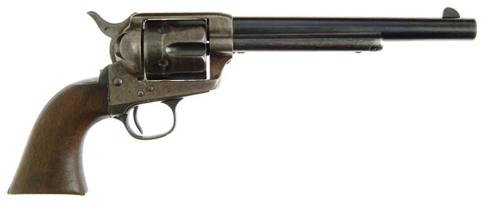 FINE US COLT SINGLE ACTION REVOLVER. Cal 45LC. SN 137142. 7-1/2” rnd bbl. Standard markings on bbl and frame including “US” on left side of frame. Left grip is dated “1891” over the “SEB” cartouche. Cartouche on right side of grip is “RAC”. The “RAC” inspector mark also appears on bottom of bbl, frame, bottom of grip, and cyl. “K” inspector mark on backstrap, triggerguard, ejector rod housing and bbl under ejector rod housing is for a factory inspector A. Kind. This revolver comes with a factory letter stating that it was shipped to the US Government inspector Stanhope E. Blunt at the Colt Factory, January 20, 1891. Blunt’s cartouche is on left side of grip. There is also a letter from John Kopec authenticating this revolver and speculating that it might be one of the guns stolen from Troop K of the 8th Calvary, October 26, 1892. This revolver was not listed, but several in the same serial number range were. Kopec bases the speculation on the fact that the gun has not been converted as all that were in service less than a year later were reworked to artillery revolvers. CONDITION: Very fine with 80% blue on bbl, ejector rod housing, cyl, backstrap and triggerguard. Worn at muzzle with a heavy drag line on cyl and light surface rust on lower part of backstrap. About 80% casehardening remains on frame, bright in protected places, fading elsewhere. Only about 20% remains on hammer. Mechanically fine. 4-30980 FS177 (20,000-25,000)