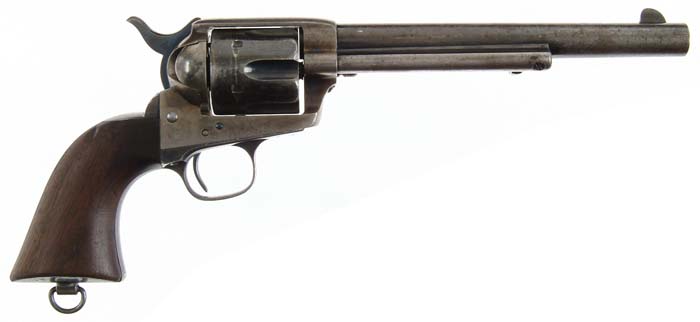 COLT SINGLE ACTION REVOLVER. Cal 45LC. SN 47564. 7-1/2” rnd bbl. Standard markings on frame and bbl. This revolver was manufactured in 1878 but no factory letter accompanies it. A letter from John Kopec gives interesting information on this revolver. It was one of 800 revolvers refurbished at the Colt factory for the state of New York. It was returned to the state on October 11th, 1895, along with SN 47684, which is the SN on the cyl of this gun. The revolver was originally inspected by Henry Nettleton and his initials appear on most of the parts including the fire blue hammer. Lanyard ring in the butt was probably installed by a New York militia armorer. Ejector rod head is a replacement, probably during the factory refurbish. Kopec notes that the fire blue finish on the hammer is correct for the long style knurling. Traces of the inspector cartouches remain on the grips. CONDITION: Retains 40% of the 1895 refurbish blue and casehardening. Grips are smooth with a few dents and scratches. Mechanically crisp. 4-30982 FS180 (12,500-17,500)