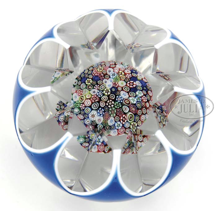 CONTEMPORARY BACCARAT DOUBLE OVERLAY MUSHROOM PAPERWEIGHT. Closepac millefiori canes comprise the mushroom and is encased in a blue and white double overlay. Entire paperweight is cut with sixteen side flutes. SIZE: 3″ dia x 2-3/8″ t. CONDITION: Very good with one minor chip to side of facet. 5-61228 (200-500)