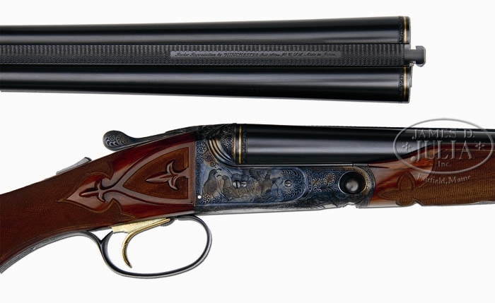 *DESIRABLE PARKER REPRODUCTION DHE GRADE SIDE BY SIDE SHOTGUN WITH CASE. SN 28-3360. Cal. 28ga, 28″ bbls, matted, tapered concave rib, single brass sighting bead, 2-3/4″ chambers, MOD/FULL chokes, ejectors and single selective trigger. Side of left bbl is marked “PARKER REPRODUCTION BY WINCHESTER-28 GAUGE. 2-3/4″ / EAST ALTON IL. U.S.A.” Right bbl is marked “MADE IN JAPAN”. The “00” frame is engraved in standard D style with setter on left side, pointer on right, 3 pheasants on trigger plate, and “PARKER” across bottom. Mounted with fiddleback walnut, side panels with spear tip drop points, checkered straight grip, checkered skeleton buttplate, gold oval engraved “AW” and checkered beavertail forend. Bore diameter: left -.552, right -.552. Bore restrictions: left -.040, right -.017. Wall thickness: left -.028, right -.027. Drop at heel:2″ , drop at comb:1-1/4″ . Weight:5 lbs. 13oz. LOP 14-1/8″. Accompanied with factory case and canvas cover, snap caps and booklet. CONDITION: Extremely fine as gun appears to be test-fired only. Bbls retain virtually all their orig blue with just a few minor handling marks. Receiver retains nearly all of its orig case color finish. Stock is sound with sharp checkering, a couple tiny handling marks and retains nearly all its orig finish. Forend is sound with sharp checkering, a couple small nicks & handling marks and retains nearly all its orig finish. Forend latch has lost about half the orig color and blending with silver patina. Mechanics are crisp with automatic safety, strong ejectors and bright, shiny bores. Case and cover are equally new/new condition with just a few minor scuffs. 4-40016 BDT60 (3,500-4,500)