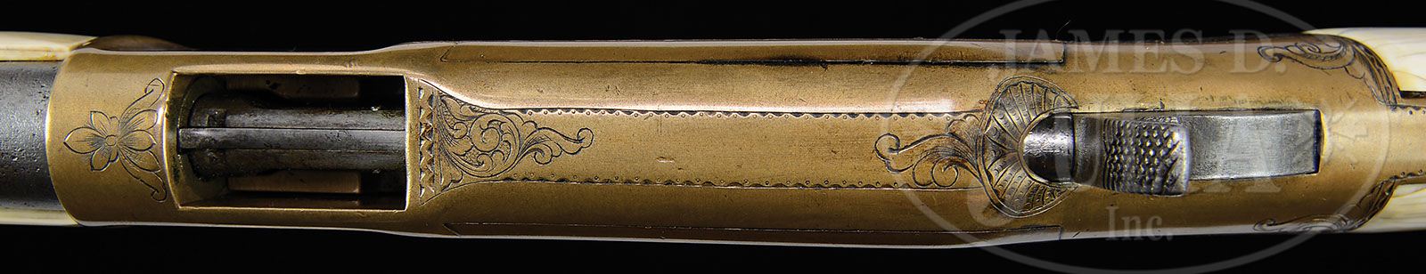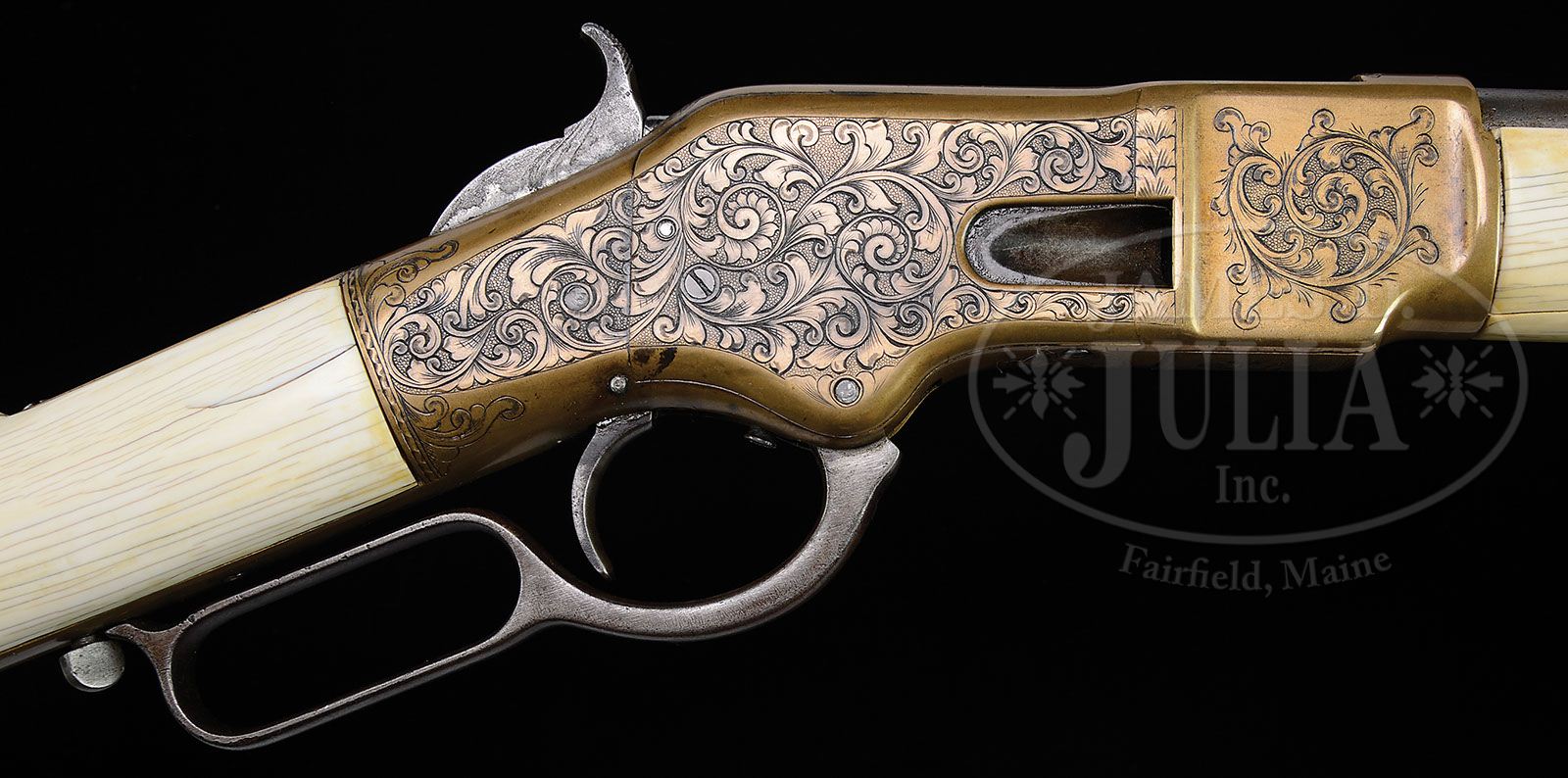 ENGRAVED WINCHESTER MODEL 1866 SADDLE RING CARBINE WITH IVORY STOCK & FOREARM. SN 44658. Cal. 44 RF Henry. Standard carbine configuration with 20″ bbl, full magazine, integral front band/sight and 2-position flip rear sight. Mounted with uncheckered old ivory with straight stock & brass carbine buttplate with trap. Receiver is post-market engraved by a very skilled artisan in Nimschke style with extremely fine, highly detailed Mexican eagle on the left side surrounded by wonderfully executed, intertwined foliate & floral patterns with fine pearled or punch-dot background. Right side has nearly full coverage matching foliate & floral engraving. Engraving extends over the top & bottom of the receiver with the distinctive Nimschke flower blossom on the bottom of the carrier and a figure-8 and rosette around the timing screws. Buttplate tang is also engraved. There were a few authentic ivory stocked ’66s produced for presentation to various South & Central American politicians and many copies produced in the ensuing years, some with great skill and artistry such as this one. The ivory used appears to have great age with its myriad dark age lines and mellow patina. Accompanied by a 2-page letter from renowned Winchester historian & author, George Madis, wherein he details & verifies most of the above information. PROVENANCE: Barnes Family Collection. CONDITION: Good to very good. Bbl, magazine tube & bands retain a cleaned gray metal patina with heavy pitting; lever & hammer area a matching patina; receiver & buttplate show rounded edges with sharp, crisp engraving and retain a dark mustard patina. Forearm has a humidity crack and the buttstock has an internal crack in the wrist with both showing myriad dark age lines and retain a wonderful mellow ivory patina. Mechanics are fine, worn dark bore with a ring about mid-barrel. 4-47660 JR213 (20,000-30,000)