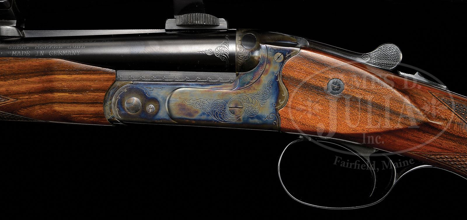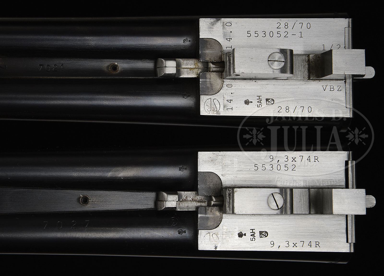 *MERKEL 141 E WITH EXTRA 28 GAUGE BARRELS, SCOPE, AMMUNITION AND CASE. SN 553052. Cal. 9.3 x 74 R and 28 ga. This fine lightweight little combo has 21-5/8″ shoe lump double rifle bbls with broad, matted rib, heavily swamped at center forming rear quarter rib, mounted with claw scope bases, and quickly acquired single standing leaf square notch rear sight with notch outlined by three light gathering beads. Day-glo orange square blade front sight is mounted in matted ramp. Side of left bbl is marked with Merkel USA information; right side with model and caliber. Case hardened, scallop-backed, petite, boxlock action features crossbolt third fastener, bushed strikers, non-automatic safety, and single non-selective trigger. Action is engraved with about 30% coverage medium scroll. Nicely streaked European walnut full capped pistol grip buttstock measures 14-5/8″ over black leather covered pad. A reinforcing pin is through side panels, coarse checkering at grip, and a sling loop on toe line. Matching slim beavertail ejector forend has Deeley release. Action is also fitted with a set of 28 ga. 28″ shoe lump bbls with matted, concave rib with the same markings as rifle bbls (except for caliber) with sling loop on bottom rib. Bbl flats of both sets are stamped with German nitro proofs, calibers, and SN (Shotgun bbls with an addition of “-1″). Shotgun bbls have their own splinter forend. Rifle Bbls: Drop at heel: approx 1-15/16″, drop at comb: approx 1-5/8″. Weight without scope: 6 lbs. 14 oz. LOP: 14-5/8″. 28 ga. Bbls: Bore diameter: left-.550, right -.549. Bore restrictions: left -.018 (Full), right -.010 (Mod). Wall thickness: left -.030, right -.032. Drop at heel: 2-1/2″, drop at comb: 1-5/16″. Weight: 5 lbs. 12 oz. LOP: 14-5/8”. Rifle bbls are fitted with Leupold “European” 2-7 Variable 30 mm scope with crosshair and dot reticle, which has bikini cover, in Recnagel rings numbered to gun. Aluminum Americase with black inset panels, has two key and one combination lock, is lined in burgundy velvet with “Merkel” embroidered on lid. Case has space for action, both sets of bbls, and scope, and contains two keys. Also included is a box containing RCBS dies, approx 350 286 grain soft point bullets, box of 20 new RWS cartridges with “Rap-X” power bonded bullets, and another with “Uni Classic” 293 grain bullets, two older boxes of RWS cartridges, one with 293 grain full jacketed bullets, the other with 258 grain H mantle bullets, another box of A square cartridges loaded with monolithic solids, an unmarked plastic box loaded with A square Dead Tough bullets, a yellow plastic box with what appear to be re-loads, as well as some A square solid and Dead-Tough bullets in cardboard boxes. PROVENANCE: J. E. Fender Collection with his notes. CONDITION: Excellent, near new, retaining nearly all orig finishes on wood and metal, with only a few faint handling marks. Bores are excellent. Action is tight. Mechanically crisp. Scope is excellent with brilliant optics. Case is excellent. Cartridges are excellent. A delightful lightweight combination that balances and handles very well with each bbl set. Ideal for the one-gun worldwide hunter. 4-48901 MGM170 (6,000-9,000)