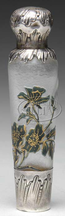 FRENCH CAMEO GLASS SCENT BOTTLE. Frosted iridescent and textured background of this scent bottle is decorated with a dark green cameo cut back floral and foliage design with gold highlights. Scent bottle is topped with a silver domed lid with silver also being at shoulder of bottle and foot. All silver has matching design. SIZE: 5-1/2″ l. CONDITION: Very good to excellent with some denting to lip and inner stopper is missing. 5-62936 (1,000-1,500)
