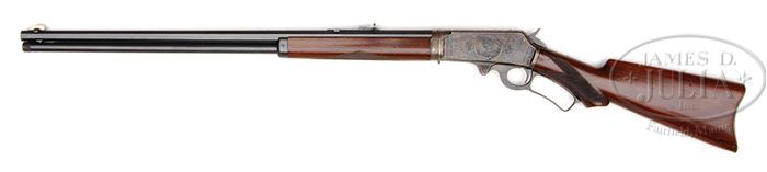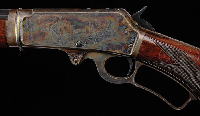 *SCARCE SPECIAL ORDER DELUXE ENGRAVED TAKEDOWN MARLIN MODEL 1893 LEVER ACTION RIFLE. SN 443457. Cal. 32 HPS (32 Winchester Spcl.). Beautiful deluxe Marlin with 26″ oct bbl, full magazine, takedown with German silver Rocky Mountain front sight and semi-buckhorn rear sight. Mounted with very nicely figured slab sawed American walnut with A-style checkered forearm and serpentine pistol grip stock with smooth steel semi-crescent buttplate that is engraved with the Olde English initials that appear to be “W.J.B.” SN is on bottom of receiver, left side of top tang under the wood, in top tang channel of buttstock and inside the buttplate. Receiver, lever & takedown ring are color case hardened. Receiver is very nicely engraved in Grade 1 style which consists of the rnd vignette of a standing whitetail buck in a very detailed forest scene with foliate arabesque patterns fore & aft and foliate arabesque patterns on right side. Engraving extends over top & bottom of receiver, top tang and sides of bbl boss. PROVENANCE: Wes Adams Estate Collection. CONDITION: Very fine plus. Bbl & magazine tube retain 98-99% crisp orig blue and the forend cap about 96-97% blue; receiver & lever retain about all of their orig case colors, strong but lightly faded on sides & top of receiver, moderately faded on bottom of receiver and outer faces of the lever; hammer retains about all of its orig blue; takedown ring retains faded case colors and the buttplate is silver patina. Stock has usual light nicks, dings & scratches and retains about all of a fine restored finish. Mechanics are crisp, very bright shiny bore. 4-44639 JR329 (12,500-17,500)