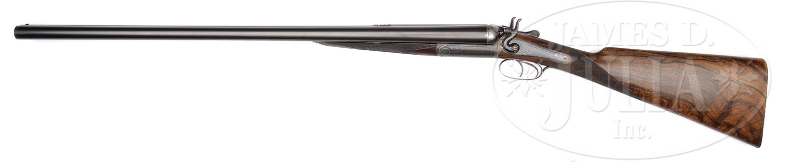 EXCEPTIONAL HIGH CONDITION HOLLAND & HOLLAND HEAVY PARADOX TOP LEVER HAMMER GUN WITH ORIGINAL CASE AND ACCESSORIES. SN 11739 ( mfg 1887). Cal. 12 ga. 2-3/4″ Chambers. 28″ Steel dovetailed bbls mounted with simple quarter rib has dolls head extension engraved “Holland & Holland. 98. New Bond Street. London.” “Winners of All the “Field” Rifle Trials. London. 1883″ and “Paradox” “Fosbery Patent”. Quarter rib is mounted with two folding leaf sights that fold flush, and are marked for 50 and 100 yards. A silver bead front sight is longitudinally dovetailed into front end of rib. Bbl flats are stamped with London black powder proofs for standard length chambers and “RCHOKE”. Bbls are fitted with Col. Fosbery’s patented rifle choke, purported to give good shot patterns (rifled bores tend to spread shot by centrifugal force) and also spin a specially made bullet giving high accuracy, capable of taking heavy game; a combination not easily accomplished, thus the name “Paradox”. This deep ratchet shaped rifled choke extends approx 2-1/2″ back from muzzles. Round bodied, top lever action with nicely filed fences, features long top strap extending over comb in H & H style, and is fitted with peninsula rebounding back action locks with round bodied serpentine hammers. Action is engraved with scroll and geometric borders. “Holland & Holland” is engraved on the top of each lockplate. Finely marbled and nicely figured European walnut straight grip buttstock measures 15″ over grooved wood butt. Point pattern flat top checkering with mullered borders is at grip, and a vacant silver oval is on toe line. Matching splinter forend has Anson release. Bore diameter: left-.734, right -.734. Bore restrictions: left -.045, right -.045. Wall thickness: left -.042, right -.042. Drop at heel: approx 2-1/16″, drop at comb: approx 1-3/8″. Weight: 8 lbs. 6 oz. LOP: 15″. This gun weighs over 8 lbs, has 2-3/4″ chambers, and loading data information in case recommends using a 4 dram powder charge for heavy game, thus this paradox falls under the “heavy” category. Most paradox guns were built to utilize a 3 dram charge. Original makers leather case has circular brass medallion on top. Leather is embossed “P. L. D.” (Factory records indicate that gun was built for Mr. Drayton.) Case is lined in royal blue cloth with large paper Holland & Holland label and two charge labels on lid, one of which is numbered to this gun. Case contains an incredible array of original cleaning and loading tools. Loading tools include: brass mold marked “Holland & Holland” “12” and “Paradox”, with three pins allowing casting of solid, small cavity, and large cavity bullets; orig screw type brass sizing die marked “Paradox” and “Regulator”; a brass tong type crimper marked “Holland & Holland” “12” “Paradox” and “Fixer”; along with an ebony handled shot and powder dipper, ebony wad rammer, and case hardened steel brass case end crimper. Cleaning equipment consists of 2-pc (short handle, long rod) rosewood and brass cleaning rod with mop, Turk’s head, and jag, as well as a black morocco wallet containing a pull-through field cleaning brush. Other tools include horn handled offset striker key, and turnscrew, each marked “G & J. W. Hawksley” and a bronze hook type ten bore broken cartridge extractor. PROVENANCE: Copy of chapter 14 of the book, “Paradox, G. V. Fosbery, H & H, and the Paradox, v. 1” where they also relate that factory records indicate that only 21 heavy load Paradox guns were built. Also included is the invoice for work done on the case. CONDITION: Excellent. Bbls retain approx 95% orig blue, silvering around muzzles, and with some rubs from contact with case, as well as a few minor light scratches. Action retains approx 90% of its orig case hardening color, most loss due to silvering on fences, again mostly from contact with case. Locks and hammers retain nearly all their orig case hardening color, with only a hint of silvering on lock tails and sides of hammer spurs. Top lever and trigger guard retain a considerable amount of their orig charcoal blue, most loss due to flaking. Flaked areas of top lever have browned, those on trigger guard are silver to brown, mostly silver at grip. Stocks retain nearly all their orig rubbed oil finish with numerous light marks and scratches, and a few a bit deeper. Bores are excellent, smooth, bright and shiny with a hint of frosting at breech end of right bbl. Action is tight. Bbls are on face. Locks are crisp. Case leather is very fine, with some stabilization, especially at corners, with a number of marks and rubs. Straps and handle are very well done restorations. Case has been expertly relined, cloth remains excellent. Labels and charge cards conserved and reinstalled. Paper of H & H label shows some soiling, rubs, and a number of marks. charge cards are foxed, and somewhat soiled. Paradox label has a slight chip and some creases. All accessories are very fine. Wood parts have most of their orig finish. Bronze of mold is toned. Lacquer on regulator is excellent. Bronze of fixer is still excellent and bright. Leather of morocco wallet has lost a good portion of its top grain and color. David J. Baker and Roger Lake, in their book “Paradox – The Story of Col. G. V. Fosbery, Holland & Holland, and the Paradox, vol. 1, pictures and describes this particular gun on pages 139 – 142 in chapter 14, and state “this gun is the best preserved early Paradox known to the authors.” 4-48706 MGM132 (40,000-60,000)