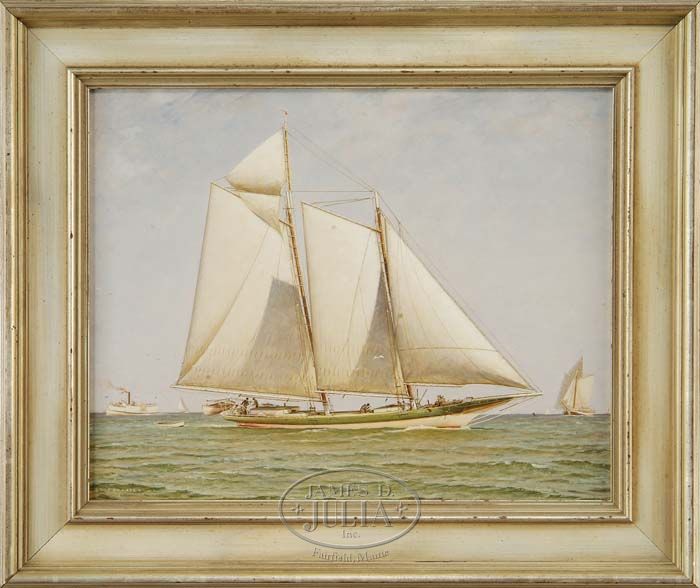 LOUIS J. FEUCHTER (American, 1885-1957) PORTRAIT OF A GREEN AND WHITE HULL YACHT. Oil on board marine scene of a two-mast schooner rigged yacht having three men aboard in full sail sailing left to right on a green tranquil ocean. A steamship and sailboat are seen off stern and a large two-mast sailboat is seen off port bow. Signed lower left “L. Feuchter 51”. Housed in a fine wide silver gilt wood frame. PROVENANCE: Rankin Estate, Annapolis, Maryland. SIGHT SIZE: 15” x 19”. CONDITION: Very good. 9-29652 MD (1,500-3,000)