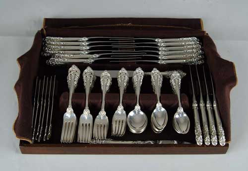 100-PIECE STERLING FLATWARE SET BY WALLACE IN THE GRAND BAROQUE PATTERN. Set consists of: Eighteen 9” knives; six 6-1/4” solid butter knives; eighteen 7-1/2” forks; twenty-three 6-1/2” forks; eleven 6” soup spoons; twenty-four 6” teaspoons. Sixty-eight pieces are lightly monogrammed. WEIGHT: 120 tr. oz. (weighable silver) CONDITION: Very good. 9-99410 (2,500-3,500)