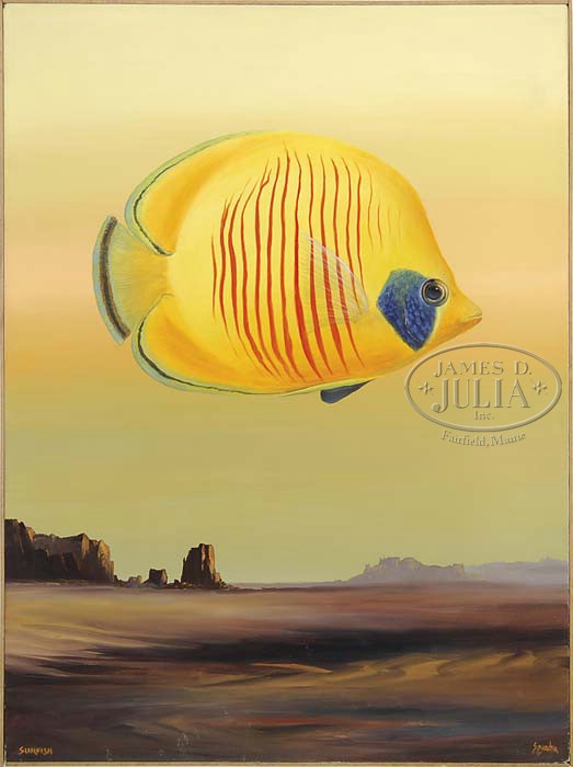 JOHN SQUADRA (American, 1932-) “SUN FISH”. Oil on canvas surrealistic scene shows a large tropical fish in colors of yellow, orange, green, red, and blue. The fish is acting as a sun over a desert western landscape. Titled lower left, signed lower right. Housed in a simple wood frame. SIZE: 46-1/2″ x 34-1/2″. CONDITION: Very good. 9-24878 (1,500-2,500)