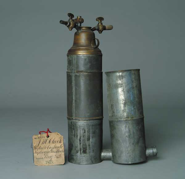PATENT MODEL: PORTABLE CARBEURATED HYDROGEN GAS MACHINE BY J.M. CLARK. Original patent tag #166,914, dated Aug. 24,1875. Two vertical cylinders, joined by horizontal pipe. Top of one cylinder is bell topped and has 3 of 4 hoses with turnkeys. SIZE: 15″ t. x 9″ w. CONDITION: Some denting to cylinders, missing one hose and one turnkey, otherwise generally good. 1-1291 (300-500) Auction: Advertising, Toy & Doll - Fall 2003 Please Note: All prices include the hammer price plus the buyer’s premium, which is paid by the buyer as part of the purchase price. The prices noted here after the auction are considered unofficial and do not become official until after the 46th day. |