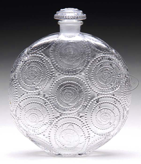 R. LALIQUE SPIRALS SCENT BOTTLE. Clear R. Lalique scent bottle is a round flat sided bottle impressed with a Spirals pattern and finished with matching stopper. Bottle is signed on the underside with raised block letters “R. Lalique”. SIZE: 6-3/4″ t. CONDITION: Very good to excellent. 5-69236 (1,000-1,200)