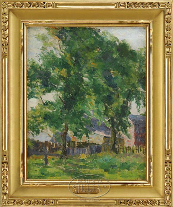 TOD LINDENMUTH (American, 1885-1976) COUNTRY BACKYARD. Oil on artist board scene shows two large trees with fence leading to a red barn. Signed lower left “Tod Lindenmuth”. Housed in a fine carved modern gilt wood frame with wood gilt artist plaque. SIZE: 18″ x 14″. CONDITION: Very good. 9-95037 (2,000-3,000)