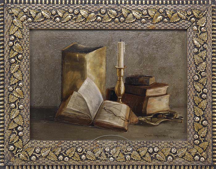 MANNER OF CLAUDE RAGUET HIRST (American, 1855-1942) STILL LIFE WITH BOOKS AND CANDLESTICK. Oil on artist board scene shows an open book with reading glasses next to three other books, brass candlestick with candle, paper sack and wick trimmers against a grayish background. Signed bottom right Claude Raguet Hirst, N.Y.”. Housed in a fine apple vine decorated period frame. Though the signature does not fluoresce, the style appears to be looser, possibly indicating an early study or a late work. SIZE: 13-1/2″ x 18-1/2″. CONDITION: Very good with a few very minor spots of inpainting, mostly in the background. 9-94165 (2,000-3,000)