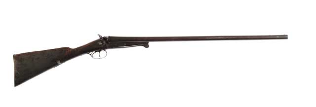 RICHARDS UNDER LEVER HAMMER SHOTGUN. Cal. 12ga. 30” damascus bbls with all metal forearm/opening lever. Back action locks, straight stock, smooth steel buttplate. NSN. CONDITION: Fair. Brown patina, worn wood, loose action. 4-48336 JR439 (Anderson Collection) (100-200)