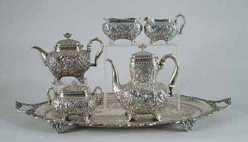 OUTSTANDING FIVE PIECE REPOUSSE TEA SET BY WHITING CO WITH SILVER PLATED TRAY. Set consists of 8-1/2” h teapot; 6” teapot; 4-1/2” covered sugar and a 3-1/4” waste bowl; 3” creamer. Set is marked “1366”, monogrammed and dated on bottom “1887”. Decoration of flowers with flower finial. Nice heavy set with nice decorative motif. Along with a Sheffield type oval silver plated footed tray with two handles. PROVENANCE: Danforth Estate, Cozy Harbor, Maine. WEIGHT: 92 tr. oz (not including tray). CONDITION: Very good. Wear to silver plate. 9-99156 (2,000-3,000)