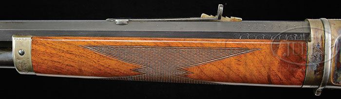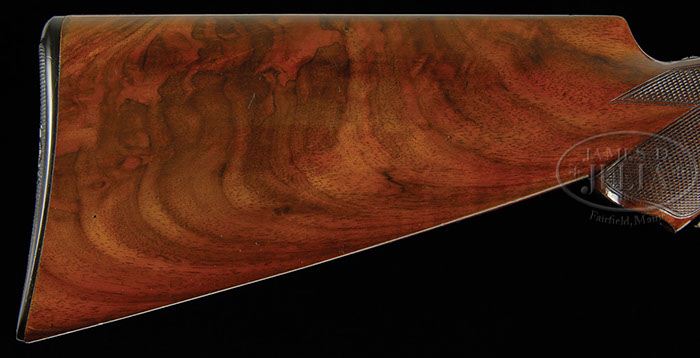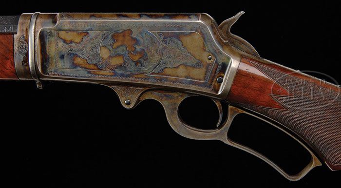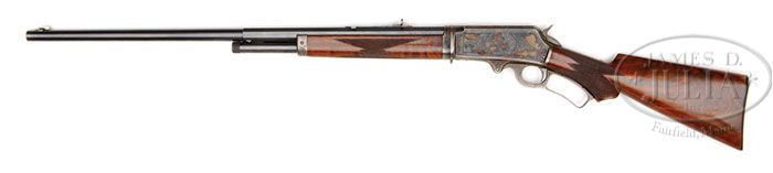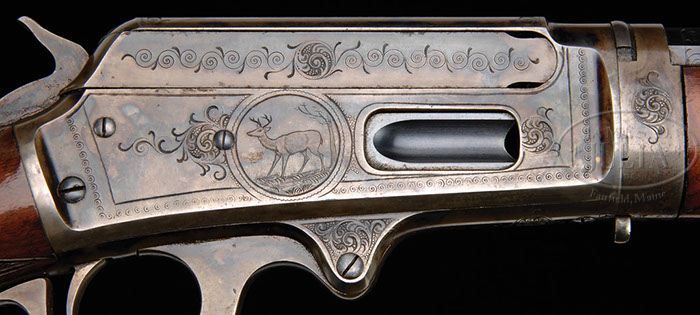 VERY RARE EARLY MARLIN MODEL 1895 SPECIAL ORDER TAKEDOWN DELUXE ENGRAVED LEVER ACTION RIFLE. SN 140978. Cal. 40-65. Spectacular big frame Marlin with 28″ oct to rnd bbl, half magazine with German silver Rocky Mountain front sight and sporting rear sight. Mounted with very highly figured burl & shell grain European walnut with B-style checkered forearm and serpentine pistol grip stock with Marlin hard rubber buttplate. SN is on bottom of frame, left side of upper tang under the wood and inside top tang channel of buttstock. Receiver, lever, hammer, takedown ring & forend cap are color case hardened. Receiver is beautifully engraved in Grade 2 style which consists of the large oval vignette of a bull elk being chased by a dog through a forest scene on the left side and the small rnd vignette of a standing whitetail buck in a woodland scene on the right side, both with foliate arabesque patterns, fore & aft, and wavelet borders. Engraving extends over the top & bottom of the receiver, top tang, lever bosses, takedown ring and forend cap. Exposed flats of bbl, at the receiver are engraved to match. There was only 5,099 Model 1895 rifles produced in the period 1895 to 1906 beginning with SN 131180. Most of these big bore rifles saw hard service, sometimes with limited maintenance and are usually found with very little orig finish. PROVENANCE: Wes Adams Estate Collection. CONDITION: Extremely fine plus. Bbl retains about 98% crisp orig blue with faint sharp edge wear and a couple of very minor nicks; magazine tube retains 96-97% strong orig blue with a couple of small nicks & scrapes; receiver retains about all of its bright orig case colors, lightly faded on top & sides, moderately faded on bottom; hammer retains bright case colors; lever retains strong case colors on sides, turned silver on outer faces; takedown ring retains 60-70% strong case colors with the balance faded to silver; forend cap retains faded case colors. Wood is sound with some light chips in the finish around buttplate and a few scattered handling & storage nicks & scratches and retains virtually all of its orig piano varnish finish. Receiver is loaded with what is probably orig grease and a dead lady bug, mechanics are fine, brilliant shiny bore, probably unfired. 4-44651 JR324 (20,000-30,000)