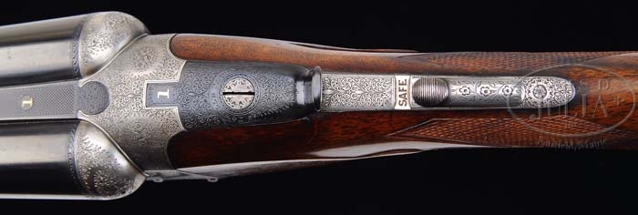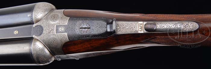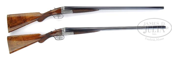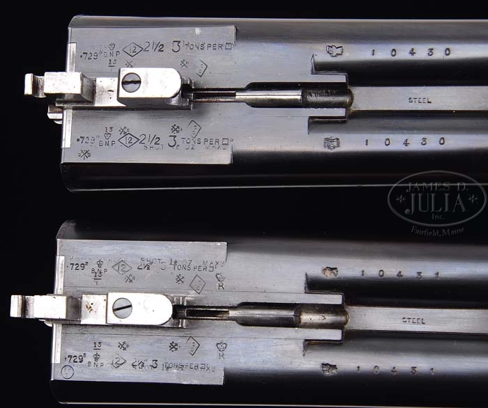 *MATCHED PAIR OF WILLIAM POWELL EJECTOR GAME GUNS WITH ORIGINAL CASE. SN 10430 and 10431. Cal. 12 Ga. 2-1/2″ Chambers. 28″ Steel dovetailed barrels have nicely matted flat narrow game ribs which are engraved “William Powell & Son. 13. Carr’s Lane, Birmingham.” with numbers “1” and “2” inlaid in gold on breech lug w/ doll’s head extension. Bbl flats have 2 sets of Birmingham nitro proofs for 2-1/2″ chambers. Bottoms of bbls are marked w/ SNs, and “Steel” is stamped into splinters. There are proofs, “Powell’s Patent” and use numbers “3112” and “3113” on water tables. Anson and Deeley box lock actions have Powell’s patented lift up thumb lever w/ vents through fences. Actions are engraved w/ finely executed bouquet and scroll, “William Powell & Son” is on both sides. Top levers are inlaid w/ gold numbers “1” and “2” respectively, and are engraved w/ scroll and “Powell’s Patent”. Trigger guards have matching scroll and SNs. Well matched streaked and figured European walnut semi pistol grip buttstocks measure 14-5/8″ over coarsely checkered wood butts on 5/8″ extensions. Stocks feature vacant silver ovals, elongated drop points, and 20 LPI checkering w/ mullered borders. Anson release splinter forends are engraved w/ numbers “1” and “2”, respectively, on forend irons w/ engraving to match remainder of guns. Checkering covers approx 80% w/ mullered borders at front. Wood is considerably darker than buttstocks. Gun number “1”: Bore diameter: left -735, right -734. Bore restrictions: left -.010, right -.010. Wall thickness: left -.026, right -.026. Drop at heel: 2″, drop at comb: 1-5/8″. Weight:6 lbs 7oz. Gun number “2”: Bore diameter: left -733, right -733. Bore restrictions: left -.008, right -.007. Wall thickness: left -.027, right -.024. Drop at heel: 2″, drop at comb: 1-5/8″. Weight: 6 lbs 7oz. Maker’s leather case, w/ brass corners and lock, has initials “G.C.” embossed on top. Interior is lined in maroon cloth w/ William Powell paper label, and charge label for these particular guns. Accessories include: 2-pc rosewood cleaning rod, ebony handled turn screw, pair of snap caps, and round oil bottle. Also included in the case are import papers. CONDITION: Fine, as refinished. Bbls retain virtually all of good London quality re-black. Actions retain traces of case color in protected areas, and are mostly a pleasing pewter color. Wood has been refinished, and retain most of their light color oil finish. Checkering has been re-cut. Actions are very slightly loose and off face. Ejectors are in time. Bores are excellent, bright and shiny w/ no visible imperfections. Case leather is dry, starting to flake, w/ numerous scuffs and marks. Interior cloth is good w/ some areas worn through from contact w/ guns, and there is some minor moth damage. Label has darkened, and has 2 areas worn through from contact w/ guns. Charge label has some stains. Accessories are fine. An unusual pair by this very high quality, but somewhat overlooked, gun maker. 4-37757 (6,000-8,000)