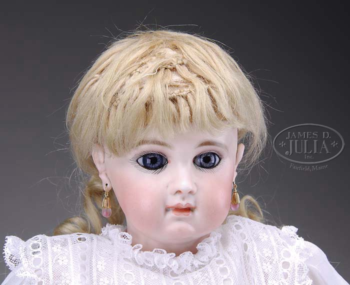 21-1/2″ RARE JUMEAU BEBE. 1880s early Jumeau with head incised “10 (over) EJ” with body stamped in blue “JUMEAU MEDAILLE D’OR PARIS”. She has lovely blue paperweight eyes, closed mouth with well modeled, applied ears, and on the original wooden composition body with 8 separate ball joints, and straight wrists with oversized hands. She is wearing what could be her original blond mohair wig, a white cotton and lace dress and pink canvas French shoes with soles impressed “10 PARIS” with the logo of a bee. SIZE: 21-1/2″ (52cm). CONDITION: Excellent, slight typical paint wear on body. 1-9325 (11,000-13,000) Auction: Advertising, Toy & Doll - Spring 2009 Please Note: All prices include the hammer price plus the buyer’s premium, which is paid by the buyer as part of the purchase price. The prices noted here after the auction are considered unofficial and do not become official until after the 46th day. |