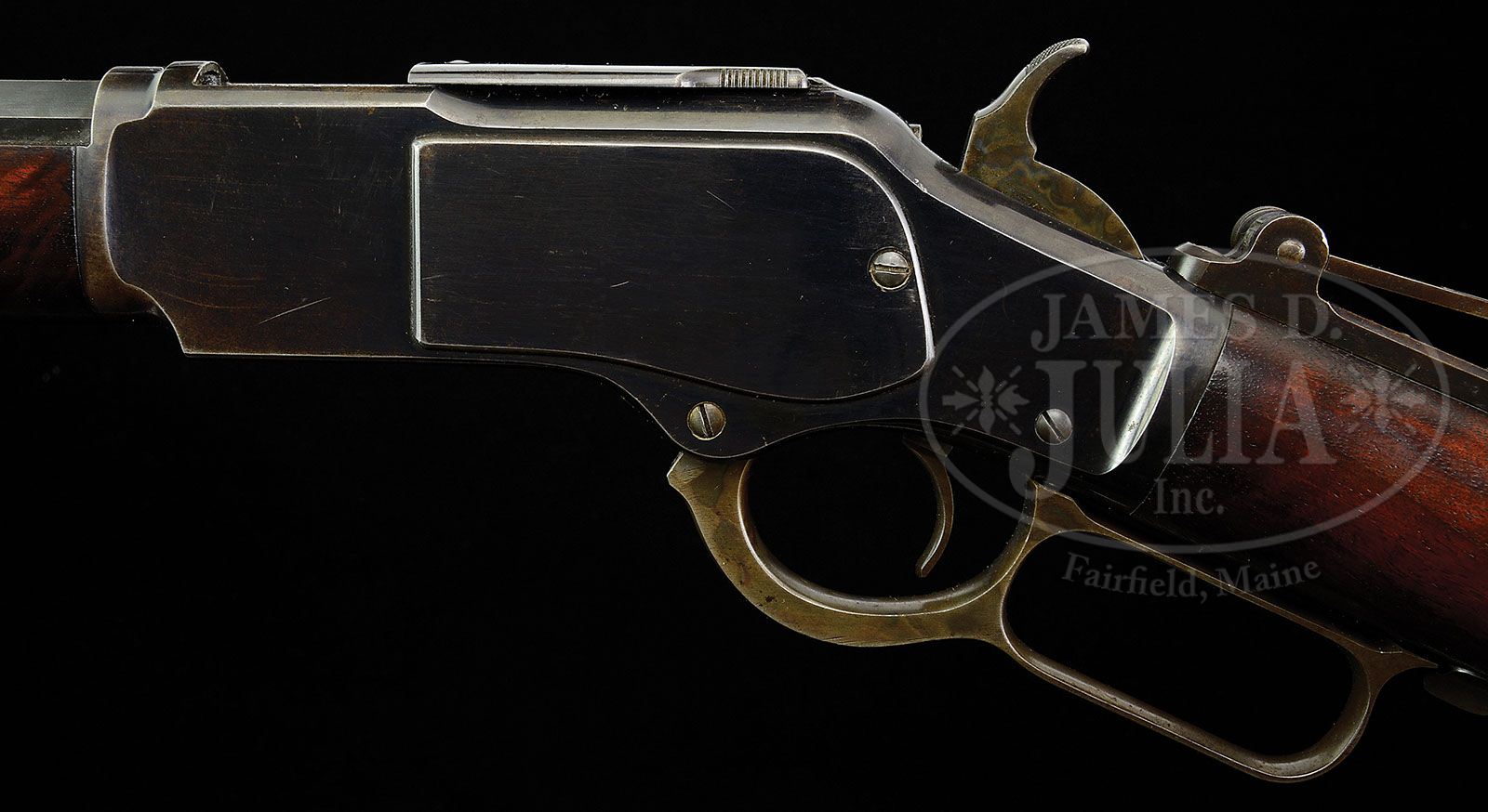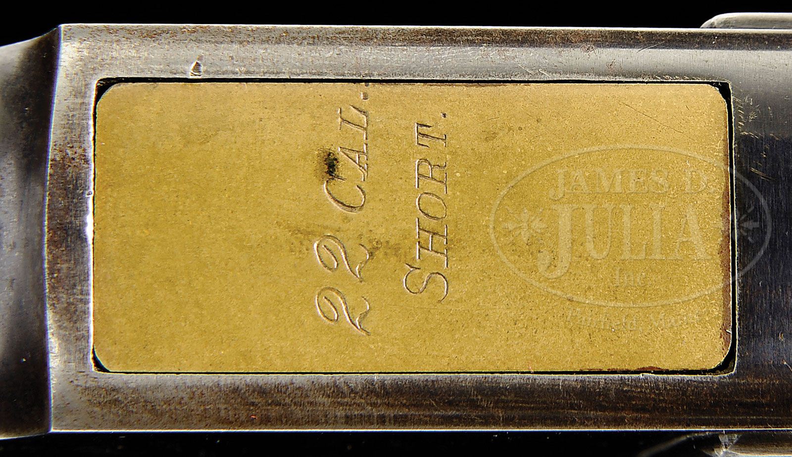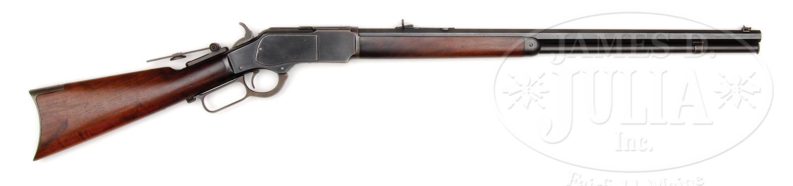 SCARCE WINCHESTER MODEL 1873 SMALL BORE LEVER ACTION RIFLE. SN 370031. Cal. 22 Short. Standard grade rifle with 24-1/4″ oct bbl, full magazine, combination front sight, semi-buckhorn rear sight and thick base tang sight with 4″ staff. Mounted with very nicely figured, uncheckered, straight grain American walnut with straight stock & crescent buttplate without trap. Inside magazine tube is original. According to Flayderman’s Guide to Antique American Firearms there were only 19,552 Model 1873 rifles chambered in both 22 Short & 22 Long, in two bbl lengths produced in the period 1884-1904. These rifles are rarely found today with orig magazine tube or with high orig finish. Apparently they were regarded as a boy’s or lady’s rifle and accorded less respect than large bore rifles used by men. Additionally it is extremely rare to find one with a bright bore. Accompanied by Cody Firearms Museum letter listing the gun with an oct bbl rifle in .22 caliber w/ plain trigger, shipped on Jan. 1, 1891 CONDITION: Very fine to extremely fine. Bbl & magazine tube retain 96-98% strong orig blue turning a little plummy on magazine tube; receiver retains about 93-95% bright orig blue, a little thin on the bottom front edge and sides of the front; hammer retains strong case colors as does the lever which has faded on outer faces; buttplate has faded to silver patina. Wood is sound with light storage & handling marks with buttstock retaining most of its bright orig finish and the forearm about 60-65% orig finish with balance a hand worn patina. Mechanics are fine, strong bright bore. 4-46856 (17,500-27,500)