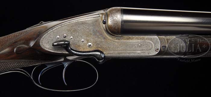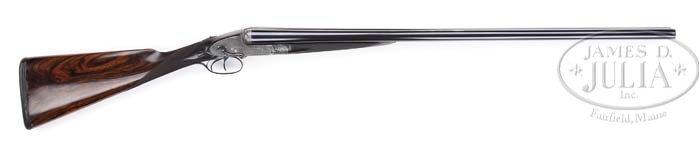 STEPHEN GRANT SIDE LEVER SIDELOCK EJECTOR PIGEON GUN WITH CASE. SN 5708. (Ca. 1887) Cal. 12 Ga. 2-3/4″ Chambers. 30-1/4″ Dovetailed bbls are engraved “Stephen Grant 67A St. James’s Street. London.” and “1” on narrow concave rib. Tops of bbls are engraved “Sir Joseph Whitworth’s Fluid Pressed Steel”. Action flats show various London proofs, the latest of which is London 2005 for 70mm chambers. SNs are on bottoms of bbls. Side lever sidelock action features automatic safety with “Safety” inlaid in gold, and has finely filed beads and fillets. Fences are filed in early Grant serpentine shape. Action and lockplates have 80% coverage of very finely executed English scroll engraving. Top of action is marked “Patent”. Lockplates are engraved “Stephen Grant.” Trigger guard is scroll engraved on bow with SN and “1” on tang. Dark, very nicely marbled European walnut straight grip buttstock measures 15-1/8″ over leather covered pad, and features vacant silver oval, drop points, and 22 LPI checkering with mullered borders. Matching splinter forend has Anson release. Bore diameter: left -.734, right -.740. Bore restrictions: left -.030, right -.017. Wall thickness: left -.030, right -.025. Drop at heel: 2-3/8″, drop at comb: 1-1/2″. Weight: 7 lbs. 5 oz, LOP 15-1/8″. Oak and leather case has brass corners. Interior is lined in dark green cloth with Grant label and charge card. Accessories include 2-pc ebony cleaning rod, leather wallet with cleaning brushes, round Parker Hale oil bottle, Atkin Grant and Lang marked snap caps, and leather hand guard. CONDITION: Fine, as refurbished. Bbls retain virtually all of a London quality re-black. Action retains 30-40% original case color, mostly faded. Silver gray on fences, beads, and bottom of action. Forend iron, side lever, and trigger guard retain virtually all of their re-blue. Stocks have virtually all of their hand rubbed oil refinish. Checkering has been re-cut, and is somewhat sharp. Bores are excellent, bright and shiny. Action is tight. Bbls are on face. Ejectors are in time. Case is fine, leather darkening. Interior is re-lined, and excellent. reproduction labels are excellent. Older cleaning rod is fine, other accessories are excellent. 4-38322 MGM88 (15,000-20,000)