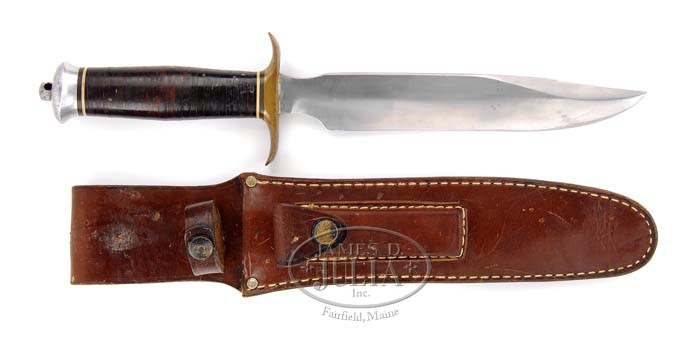 EXTREMELY RARE SPRINGFIELD RANDALL NO. 1 FIGHTING KNIFE WITH SHEATH. SN NSN. Rare Randall No. 1 fighting knife with 7-3/4″ clip point blade marked on left side “RANDALL MADE / SPFLD. MASS.” with the Randall scimitar at each end. It has a dbl sided curved brass handguard with stacked leather handle that has black & white spacers with an oval aluminum pommel cap & nut with a lanyard hole. Accompanied by its orig brown leather sheath with thin, narrow sharpening stone pocket on front & handle strap on belt loop. Stone pocket contains the orig Norton Washita sharpening stone that has been broken & repaired. Only 1,200 of these rare knives were made in period 1943-45 under license to William F. Larsen of Northampton Cutlery Co., Springfield, Mass. The sheaths were made by Southern Saddlery Co., of Chattanooga, TN. Back of sheath is marked in ink “ENS. F. Miller / USN P? / VF64B”. Below that inscription, stamped into the leather is an anchor with “US” on each side. Further down the body of back of sheath, in ink, is “W.W. du Mont / 38 Mill Road / Falmouth, Mass.”. This knife apparently became the property of Ensign Miller (Dr. Frank Miller) who maintained it in his possession from his service during WWII until being consigned to this auction. A truly rare find, being an identified rare WWII fighting knife. PROVENANCE: Dr. Frank Miller Estate Collection. CONDITION: Knife is very fine. Blade has full shape having been polished & lightly sharpened at some time during its period of use. Handguard is a dark mustard patina & leather handle is in outstanding condition. Sheath is also very fine retaining most of its orig bright brown leather finish with white stitching with minor scratches & soil. Stone, as previously noted, is broken & repaired. 4-35762 JR312 (2,500-4,000)