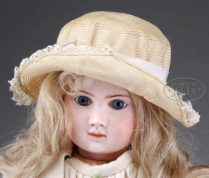 22″ PHENIX BEBE DOLL. 1890s closed mouth French doll incised near neck socket “*93” with open/closed mouth with slight space between lips with partial view of tongue tip, blue-gray paperweight eyes, evenly feathered eyebrows, well modeled ears on a fully jointed French wood and composition body stamped on the torso “Le Petit Parisien BEBE STEINER Medaille D’or Paris 1889”. She is well redressed in a two piece cream wool costume with pleated center panel. Wig is a newer ash blonde human hair wig and her shoes are brown leather with replaced soles. SIZE: 22″ (56cm). CONDITION: Good. Faint hairline on left side of forehead. Arms and hands, although old, are of from a different mfg. 1-9326 (1,000-2,000) Auction: Advertising, Toy & Doll - Spring 2009 Please Note: All prices include the hammer price plus the buyer’s premium, which is paid by the buyer as part of the purchase price. The prices noted here after the auction are considered unofficial and do not become official until after the 46th day. |