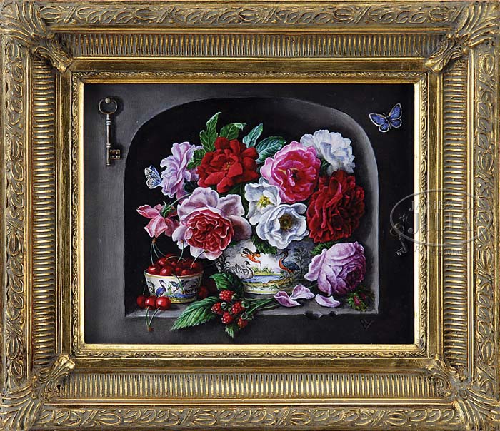 BARBARA VALENTINE (English, 20th Century) STILL LIFE IN AN ALCOVE. Oil on wood panel shows a colorful arrangement of white, pink and red flowers in a bird decorated vase having raspberries and strawberries beside. There are two butterflies and two keys elsewhere in the scene. Signed lower right with conjoined initial monogram “BV”. Housed in a modern gilt frame. SIZE: 8″ x 10″. CONDITION: Very good, warp to panel. 9-98033 (1,000-1,500)