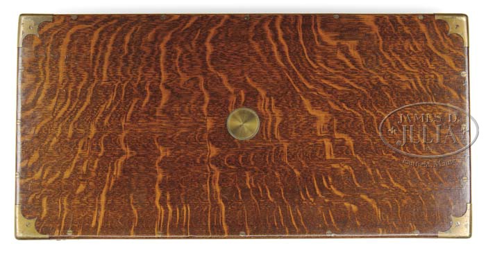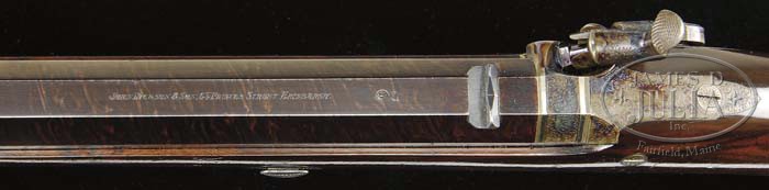 EXQUISITE PAIR OF DICKSON PERCUSSION DUELING PISTOLS WITH ORIGINAL CASE, ACCESSORIES, AND OUTER COVER, MADE FOR CHARLES GORDON. SN 4894/ 4895. (ca. 1897) Cal. .590. This wonderful pair of pistols was made for the noted eccentric collector, Charles Gordon, who commissioned dozens of anachronistic high quality guns from many of Britain’s top gun makers, most notably Dickson’s of Edinburgh. These guns replicate a pair of dueling pistols from the 1830’2 or 1840’s, featuring 10″ octagonal browned twist bbls of large caliber, and smooth bore, in this case mounted with express sights. Tops of bbls are engraved “John Dickson & Son. 63 Princes Street Edinburgh.” with “1” and “2” for each gun, respectively. Percussion patent breeches have engraved platinum “blow-outs” and inlaid platinum bands fore and aft. Breech irons with integral fences are nicely scroll engraved and marked either “1” or “2”. Case hardened back action peninsula locks are fitted with rifle style flat bodied hammers. Front sliding safety bolts engage hammers at half cock. Locks and hammers are engraved with exceptionally well cut small shaded scroll. “John Dickson & Son” is in scrolled ribands on each plate. Charcoal blued scroll engraved trigger guards have pineapple finials and SNs on tangs. Nicely streaked, and slightly figured stocks extend to muzzles, are affixed to bbls with two side nails through engraved oval steel escutcheons. Scroll engraved ramrod pipes hold rosewood ramrods with brass tulip heads and rounded tails. Stocks terminate in case hardened steel capped butts with wraparound flat top coarse checkering, and have vacant gold oval crest plates at tops of grips. Pistols are housed in quartered oak case with pivoting hook closures, inlet brass corners, and central brass disk on lid. D-ring brass carrying handle is on right side. Case is lined with diamond embossed tan leather, with light chocolate brown gold-embossed pigskin Dickson label on lid. Case compartments are both semi-French fitted, and full French-fitted, holding a fine array of original accessories, as was much loved by Mr. Gordon. Accessories include a turned boxwood patch container, another one matching for caps; 2 turned ivory bottles, each containing a spare nipple marked “1” or “2”; two small copper bodied “C & J. W. Hawksley” powder flasks; two “Davis Improved” round ball molds marked “No. 25”; single Hawksley pewter oil bottle; single polished steel and case hardened patch cutter marked “S.A”; two horn handled Hawksley turnscrews; horn handled nipple key; rosewood loading rod with ovoid ebony top, and brass jag tip; and two spare ramrods with brass tulip heads, and tails with steel worms under caps. Quartered oak central box with sliding cover contains some round lead balls. There are two covered compartments with brass knobs, one containing the original key. This spectacular case comes with its original harness leather outer cover, lined with mattress ticking, with four flap closure, secured by two straps. There are two lateral belts around outer cover for added security. Heavy leather carrying handle is on end opposite flaps. Top of case cover is embossed “CHARLES GORDON ESQ”. PROVENANCE: 1965 Factory letter with factory records, and old description of the pistols. CONDITION: Exceptionally fine, near new, possibly unfired. Pistols retain nearly all their orig brilliant finish, with only the slightest silvering on the sharpest edges of bbls, and barely noticeable thinning of case color on tail of lock on pistol no. “1”. Stocks retain nearly all of their French polish finish with only a few very light handling marks, and one or 2 deeper knocks with some slight chipping of finish toward muzzle of pistol no. “1”. Bright blue of trigger guards has some flaking at grips. Bores are bright and shiny, and appear to have their orig polish. Locks are crisp. Exterior finish of case is excellent, with only a few minor marks and some lifting of lacquer on brass. Interior leather is very fine, showing some compressions and rubs, from contact with guns and accessories. Label is excellent except a minor rub in center from brass knob of central compartment. All accessories are generally excellent. One spare ramrod is a replacement, being of ebony and not rosewood. Outer cover is very fine, leather still light in color with many minor marks and some darkening and lifting of grain on corners, some of which are beginning to come unstitched. Closure flaps are fine, but show cracking and lifting of grain, and becoming brittle. One of the closure straps is missing, and one of the straps around case has tongue detached, the other repaired. 4-45078 MGM195 (15,000-25,000)