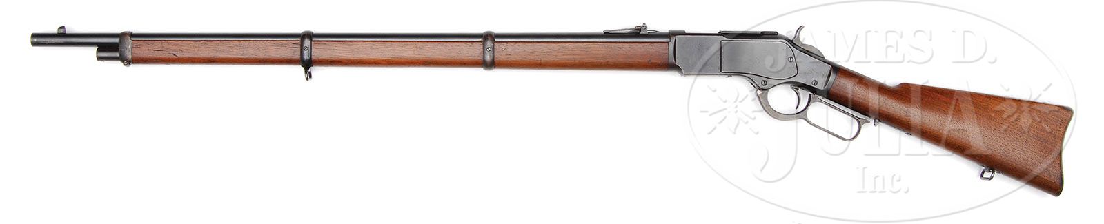 RARE WINCHESTER MODEL 1873 LEVER ACTION MUSKET. SN 163542. Cal. 44 WCF (44-40). Standard third model musket with 30″ rnd bbl, full magazine, square base barleycorn front sight/bayonet lug and Spencer style musket leaf rear sight graduated to 900 yards. Receiver is third style with milled dust cover rail and smooth dust cover with serrated rear edges. Mounted with uncheckered, straight grain American walnut with full length forearm & straight stock that has carbine/musket buttplate with trap. Forearm is secured with three bands. Front band has the extremely rare feature of a saber bayonet stud on the right side. Middle band has a sling loop with corresponding loop in buttstock. Accompanied by an orig saber bayonet that has 20-1/8″ Yataghan blade, brass handle with feathered body & eagle pommel and an orig leather scabbard, with brass tip & throat. Blade has small proofs on each side of the ricasso. Also accompanied by a Cody Firearms Museum letter which identifies this musket with saber bayonet & scabbard, received in warehouse Sept. 23, 1884 and shipped same day to Order #15644. According to The Winchester Book, Madis, Model ’73 muskets with saber bayonet lugs are extremely rare, most were equipped for socket bayonets. There were about 721,000 Model 1873 firearms produced and according to the referenced publication only 5% were muskets. Extrapolation of those figures shows that there were only about 36,000 muskets produced and of those, very few were equipped with saber bayonets. PROVENANCE: Barnes Family Collection. CONDITION: Musket is very fine. Bbl retains 96-98% crisp orig blue with the bands showing high point wear and some thinning of the blue; receiver retains about 95% strong orig blue with sharp edge wear and a few surface spots and fine flaking; loading gate retains most of its orig fire blue; hammer retains strong, dark case colors and the lever bright case colors on the sides, moderately faded on outer faces, turned dark on the loop. Wood is sound with light handling & use nicks & scratches and a series of small bruises on the forearm and overall retains most of its orig oil finish. Mechanics are crisp, brilliant shiny bore. Bayonet is crisp & clean with much orig polish on the blade & light discoloration; handle is also clean & bright with light brass patina; scabbard shows some chipping in the finish, otherwise retains most of its added black finish with a couple of minor dents in the tip & throat which are a dark coffee colored patina. 4-47635 JR224 (5,000-8,000)