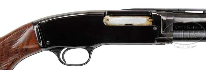 *RARE WINCHESTER MODEL 42 VENT RIB SKEET PUMP SHOTGUN. SN 156172. Cal. 410. 28″ bbl with Winchester special ventilated rib having small oval style posts without patent markings on left side of rib. No. 81-A front bead. Skeet choke. Bbl has standard left side roll markings. Skeet style pistol grip stock with steel grip cap with full fancy black walnut. LOP: 13-3/4″ over orig buttplate. Weight: 6 lb. 5.8 oz. Skeet style extension forend of straight grain black walnut. PROVENANCE: Ned Schwing Collection. A personal letter about this gun from Ned Schwing will accompany the lot. CONDITION: Very fine. Over 98% orig Du-Lite bluing showing only minor wear from pump handle operation. Excellent orig stock finish with very minor handling marks. Tight crisp mechanics with little signs of usage. Very good bright bore. 4-42586 DS21 (7,500-12,500)
