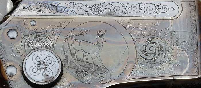 *SPECTACULAR FACTORY ENGRAVED & INSCRIBED DELUXE MARLIN MODEL ’97 LEVER ACTION RIFLE. SN 354174. Cal. 22. Wonderful little Marlin with 24″ tapered oct bbl, full magazine, ivory bead front sight and semi-buckhorn rear sight. Mounted with beautiful, highly figured, shell grain American walnut with style “B” checkered forearm and serpentine grip stock with orig hard rubber buttplate. Inside top tang channel of buttstock is stamped with matching SN. Receiver & forend cap are beautifully engraved by Conrad Ulrich in #2 style which consists of the large vignette of a running whitetail buck being chased by a wolf through a forest scene. Right side has a smaller vignette of a standing bull elk in a mountain scene. Both vignettes are surrounded by foliate arabesque patterns with wavelet borders. Top left side of receiver is engraved, also by Mr. Ulrich, in period script “N.B. Miller”. Engraving extends over top of receiver, over chamber area of bbl, top tang & forend cap. Deluxe Model ’97s are scarce, engraved ones are rare and inscribed engraved examples are extremely rare. CONDITION: Extremely fine, all matching. Bbl & magazine tube retain about 95% crisp orig blue with scattered spots of pin prick pitting; receiver retains virtually all of its brilliant, fiery case colors and the hammer moderately faded case colors; lever retains bright case colors on sides, moderately to heavily faded on outer faces. Wood is sound with a very few, very light nicks & scratches and retains virtually all of its crisp orig varnish with the feathery raised grain look. Mechanics are crisp, brilliant shiny bore. 4-46115 JR240 (12,500-17,500)